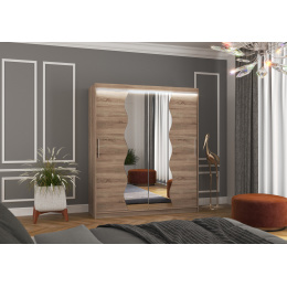 Šatní skříň s posuvnými dveřmi a zrcadlem KANSAS je ideálním způsobem, jak uspořádat prostor. Nábytek je vybaven prostornými policemi a tyčí, na kterou můžete pověsit šaty, obleky, svrchní oděvy nebo košile. Na čelní stranu byla připevněna zrcadla, která opticky zvětšují prostor. Díky tomu, že skříň je posuvná, nemusíte vyčleňovat další místo na otevření dveří, což z ní činí ideální řešení pro malý pokoj nebo úzkou předsíň. Zajímavým prvkem je efektní LED osvětlení, které dodává skříni i místnosti nádherný půvab.