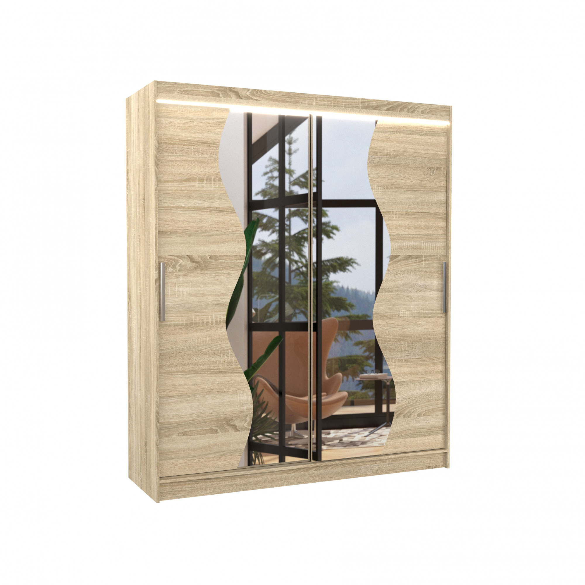 Šatní skříň s posuvnými dveřmi a zrcadlem MEDISON je ideálním způsobem, jak uspořádat prostor. Nábytek je vybaven prostornými policemi a tyčí, na kterou můžete pověsit šaty, obleky, svrchní oděvy nebo košile. Na čelní stranu byla připevněna zrcadla, která opticky zvětšují prostor. Díky tomu, že skříň je posuvná, nemusíte vyčleňovat další místo na otevření dveří, což z ní činí ideální řešení pro malý pokoj nebo úzkou předsíň. Zajímavým prvkem je efektní LED osvětlení, které dodává skříni i místnosti nádherný půvab.