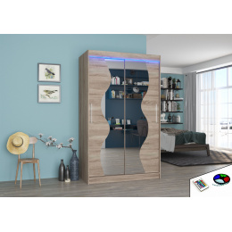 Posuvná skříň se zrcadlem OSWALD je ideálním způsobem, jak uspořádat prostor. Nábytek je vybaven prostornými policemi a tyčí, na kterou můžete pověsit šaty, obleky, svrchní oděvy nebo košile. Na čelní straně byla připevněna zrcadla ve tvaru vlny, která opticky zvětšují prostor a zároveň dodávají jedinečný styl. Díky tomu, že skříň je posuvná, nemusíte vyčleňovat další místo na otevření dveří, což z ní činí ideální řešení pro malý pokoj nebo úzkou předsíň. Zajímavým prvkem je efektní LED osvětlení, které dodává skříni i místnosti nádherný půvab.