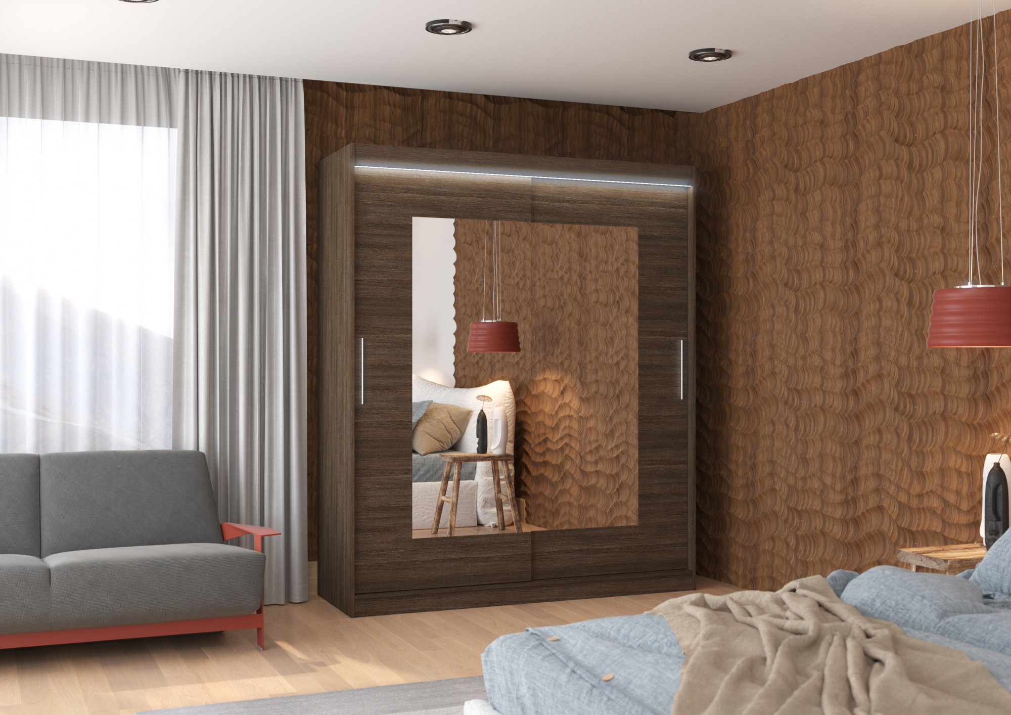 Šatní skříň s posuvnými dveřmi a zrcadlem ROSETTE je ideálním způsobem, jak uspořádat prostor. Nábytek je vybaven prostornými policemi a tyčí, na kterou můžete pověsit šaty, obleky, svrchní oděvy nebo košile. Na čelní stranu byla připevněna zrcadla, která opticky zvětšují prostor. Díky tomu, že skříň je posuvná, nemusíte vyčleňovat další místo na otevření dveří, což z ní činí ideální řešení pro malý pokoj nebo úzkou předsíň. Zajímavým prvkem je efektní LED osvětlení, které dodává skříni i místnosti nádherný půvab. zrcadlo uprostřed