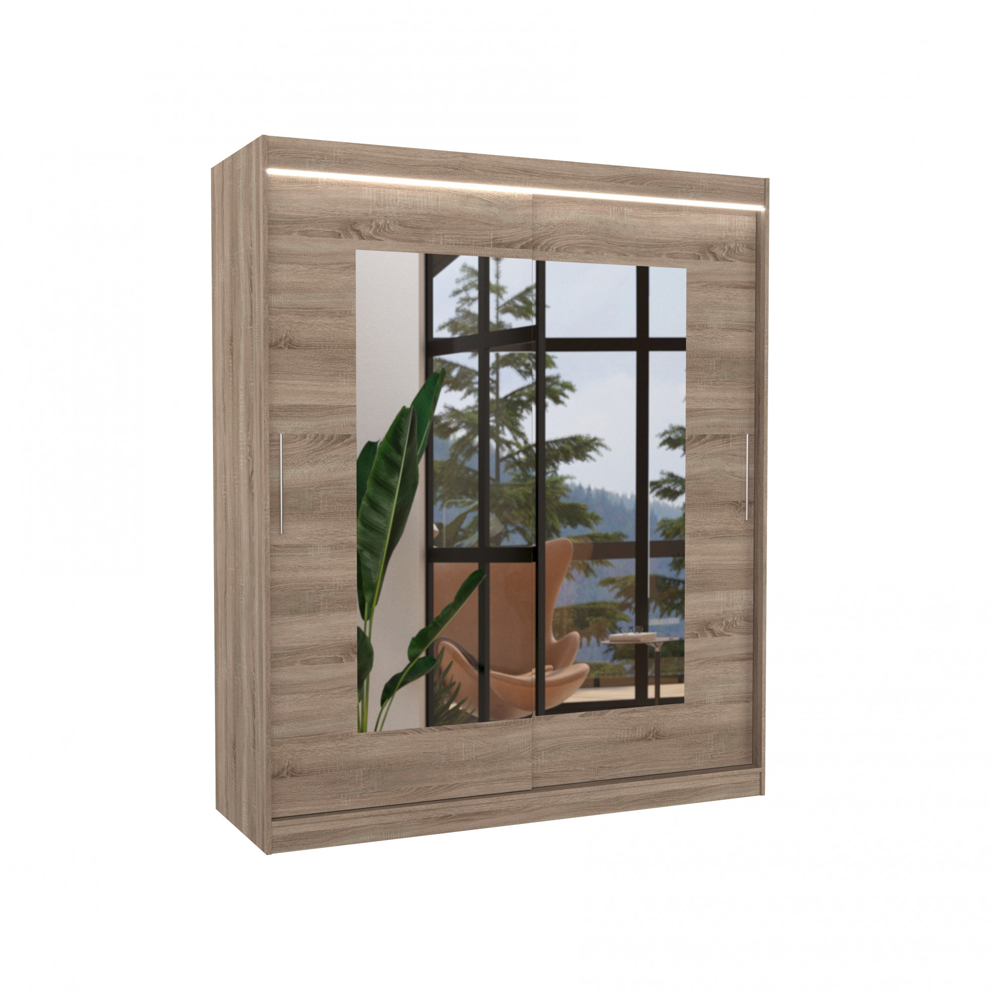 Šatní skříň s posuvnými dveřmi a zrcadlem ROSETTE je ideálním způsobem, jak uspořádat prostor. Nábytek je vybaven prostornými policemi a tyčí, na kterou můžete pověsit šaty, obleky, svrchní oděvy nebo košile. Na čelní stranu byla připevněna zrcadla, která opticky zvětšují prostor. Díky tomu, že skříň je posuvná, nemusíte vyčleňovat další místo na otevření dveří, což z ní činí ideální řešení pro malý pokoj nebo úzkou předsíň. Zajímavým prvkem je efektní LED osvětlení, které dodává skříni i místnosti nádherný půvab.