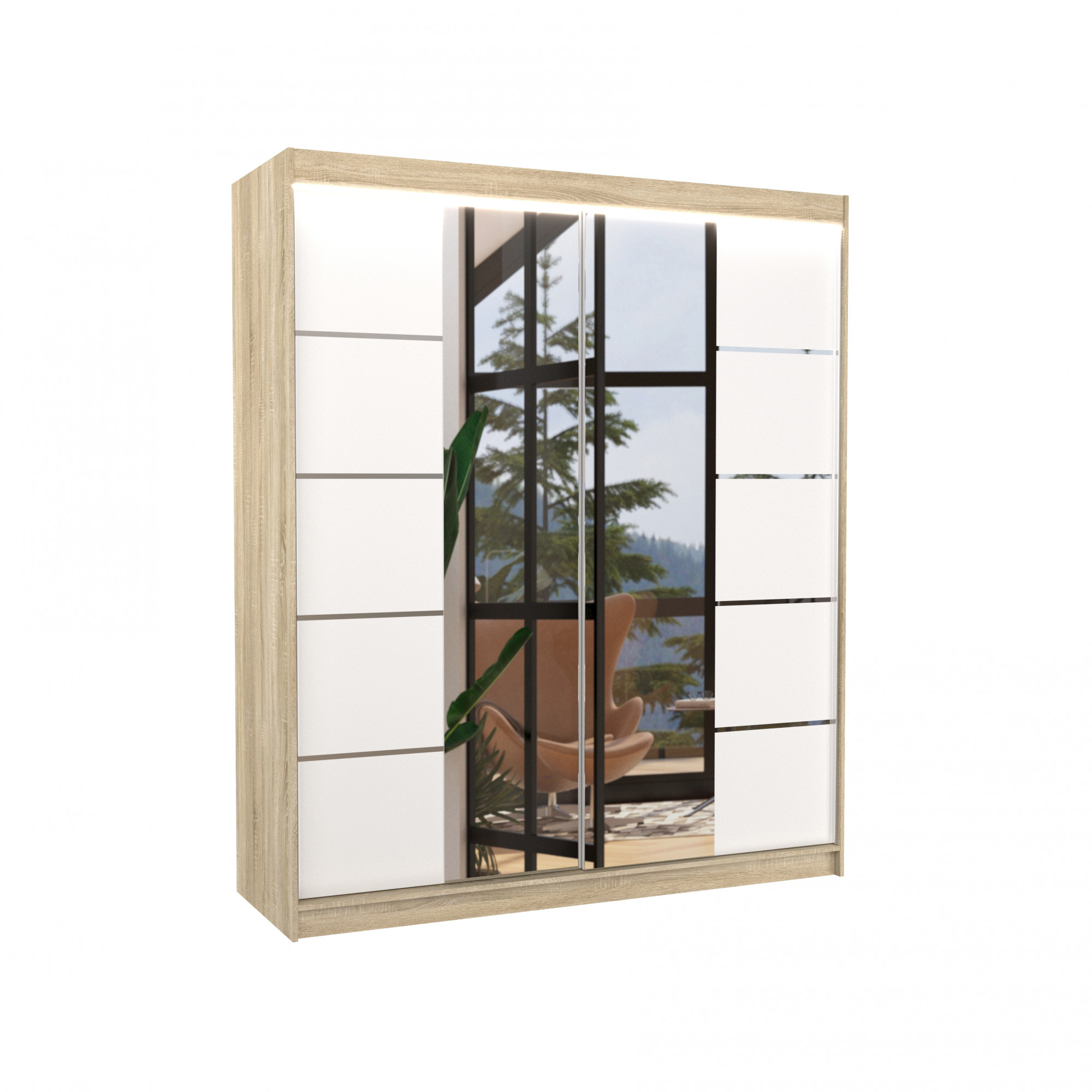 Posuvná skříň se zrcadlem a LED osvětlením TRAVES 180 Sonoma+White