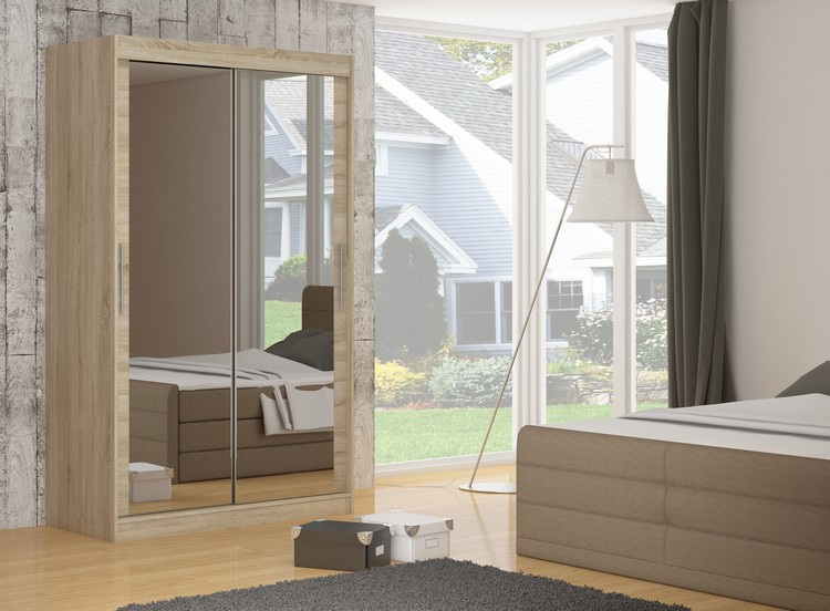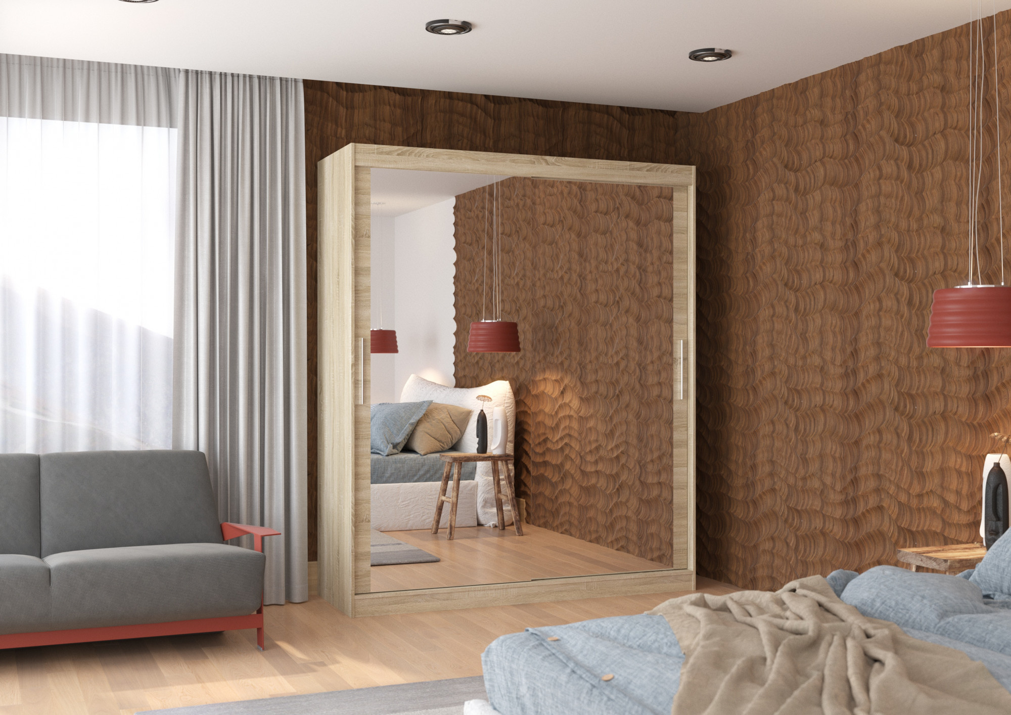 Šatní skříň s posuvnými dveřmi a zrcadlem ETTORE je ideálním způsobem, jak uspořádat prostor. Nábytek je vybaven prostornými policemi a tyčí, na kterou můžete pověsit šaty, obleky, svrchní oděvy nebo košile. Na čelní stranu byla připevněna zrcadla, která opticky zvětšují prostor. Díky tomu, že skříň je posuvná, nemusíte vyčleňovat další místo na otevření dveří, což z ní činí ideální řešení pro malý pokoj nebo úzkou předsíň.