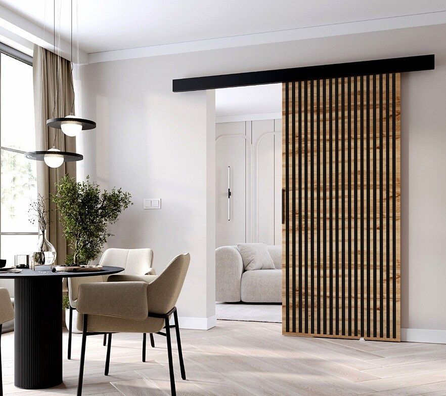 Model L90 MIX je inovativní a funkční řešení, které dokonale doplní jakýkoli interiér, zejména tam, kde je prostor omezený. Díky modernímu posuvnému systému tyto dveře nabízejí snadné použití a optimalizují prostor, čímž eliminují potřebu dalšího prostoru pro otevírání tradičních dveří. Jsou vynikající volbou pro menší byty, kde záleží na každém centimetru, ale dobře se hodí i do větších místností, kde jim dodávají moderní charakter.
