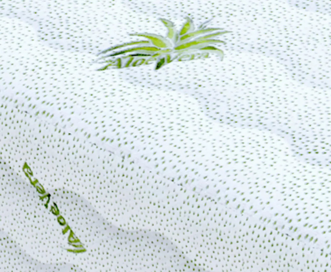 Prošívaný potah matrace Aloe v prošívané verzi se vyznačuje antialergickými a antibakteriálními vlastnostmi díky použití speciálního vlákna při výrobě. Její jedinečnost spočívá v tom, že je namočená v extraktu z listů aloe vera, který příznivě působí na krevní oběh a je šetrný k pokožce. Poskytuje ochranu proti nadměrnému růstu roztočů. Díky svým tepelným vlastnostem vyniká také výbornou propustností vzduchu. Je ideální volbou pro místnosti dobře osvětlené sluncem, protože účinně pohlcuje UV záření.