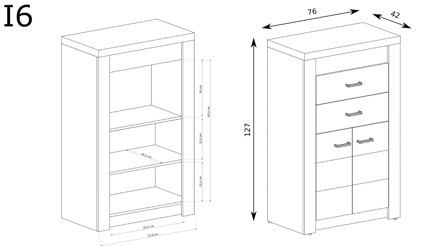Komoda vysoká 127 cm. Spodní část tvoří šatní skříň s dvojitými dveřmi a úložnou policí, která rozděluje prostor na polovinu, takže prostor v komodě lze využít na 100 %. Komoda má dvě zásuvky, které se otevírají pomocí krásných kovových úchytek. Varianta horní desky s LED diodami dodává vzhledu nábytku další rozmanitost. K dostání ve třech barvách.