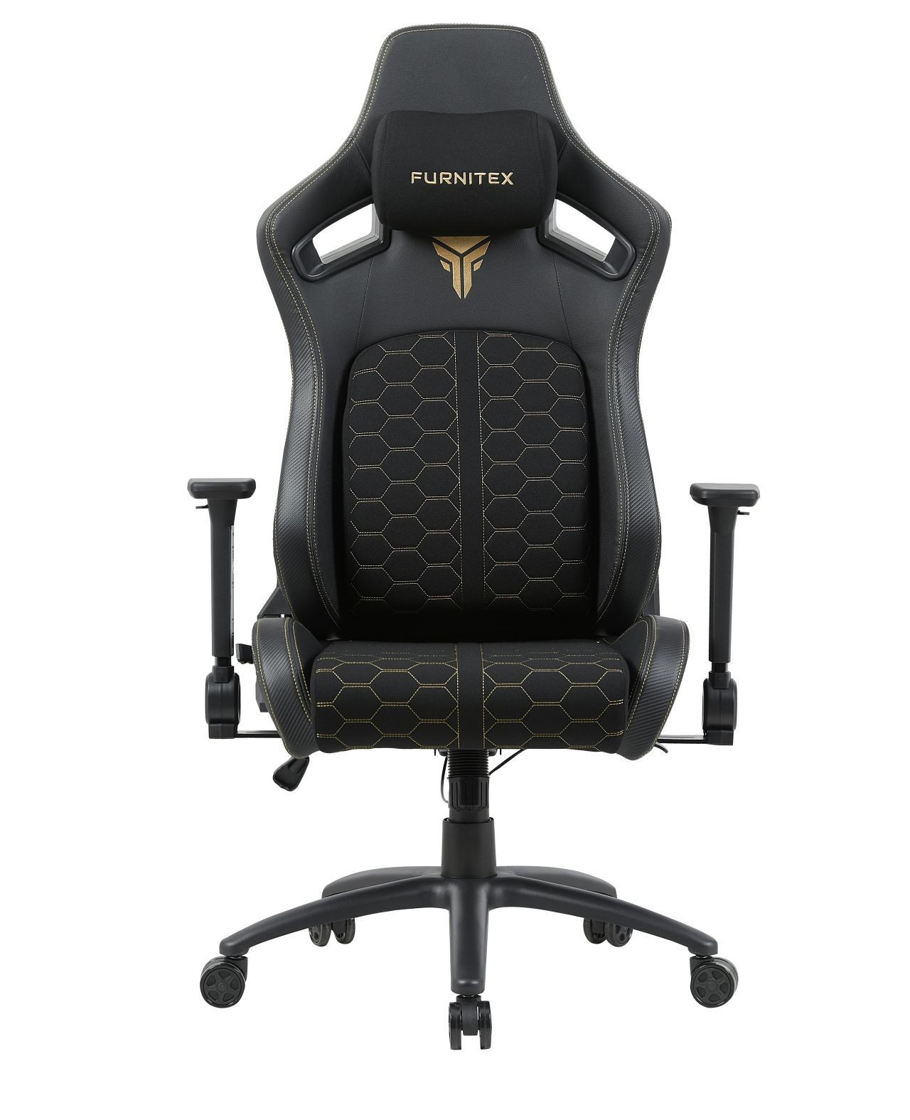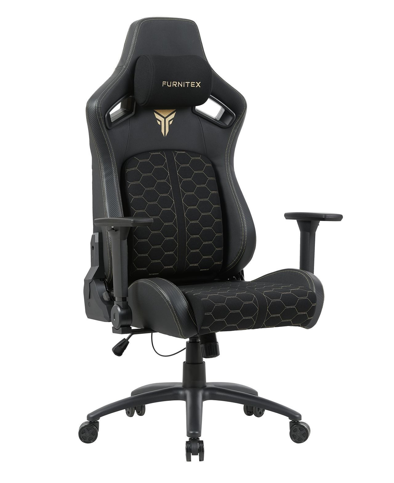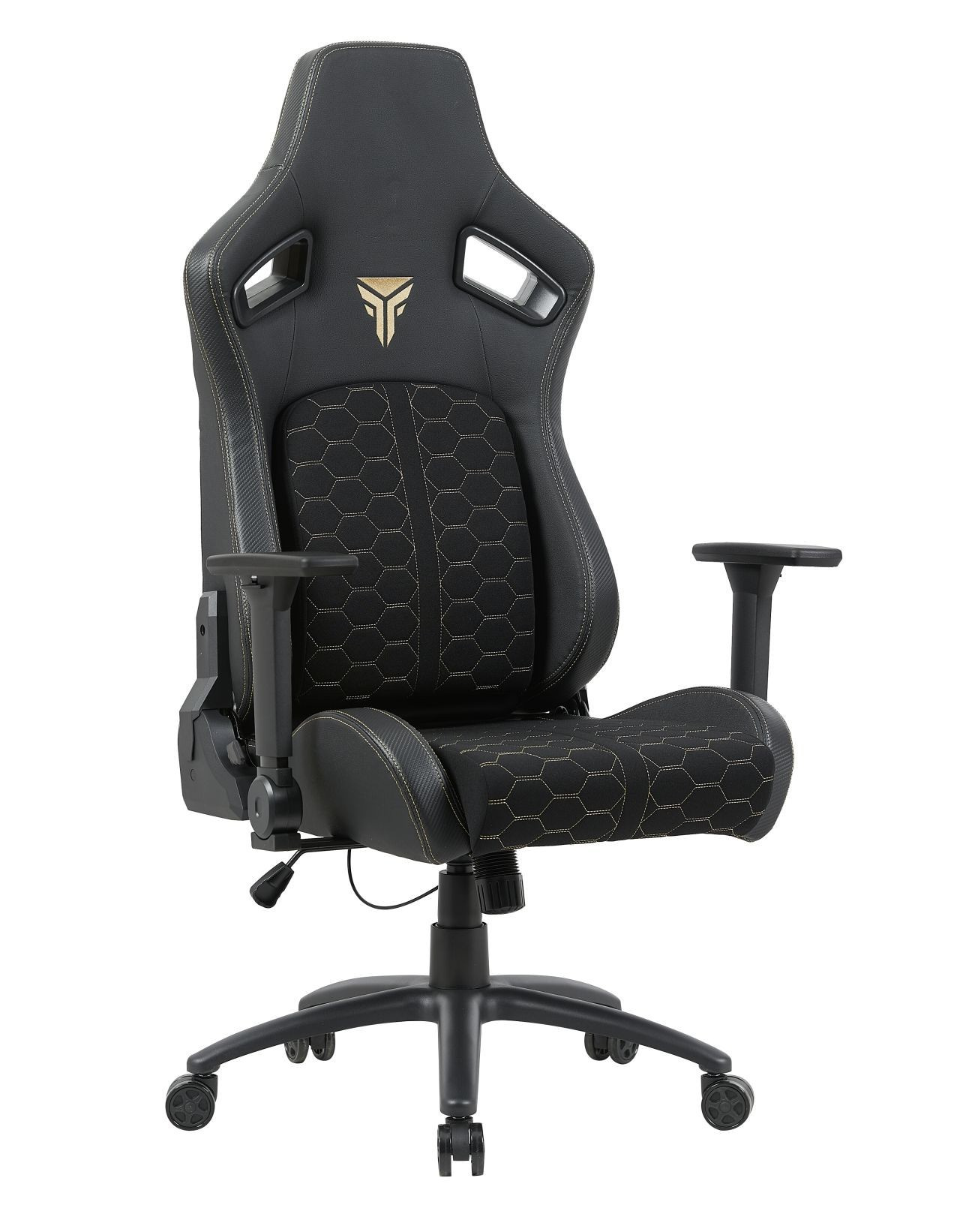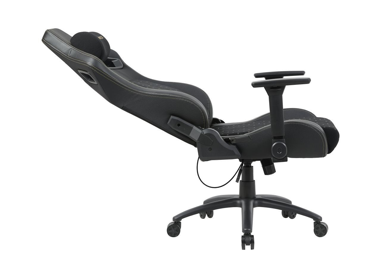 FUNKCE: - mechanismus: TILT + sklápěcí opěradlo - nastavitelná bederní část (vpřed - vzad) - područky: nastavitelné - polštářek pod krk (odnímatelný) Rozměry: - celková šířka: 72 cm - šířka sedáku: 58 cm - celková hloubka: 61 cm - výška opěradla: 89 cm - celková výška: 133-141 cm - výška sedáku: 49-57 cm Materiál - čalounění: látková tkanina + ekokůže - základna: PP plast - píst třídy 4 Barva: - černá se zlatými vložkami