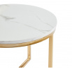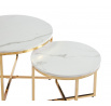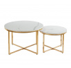 Rozměry: *větší stolek: - deska: průměr: 70 cm - výška: 45,5 cm *menší stolek: - deska: průměr 50 cm - výška: 38 cm Materiál: - deska: MDF (dýha) - nohy: chrom Barva: - deska: bílý mramor - konstrukce: zlatý lesk