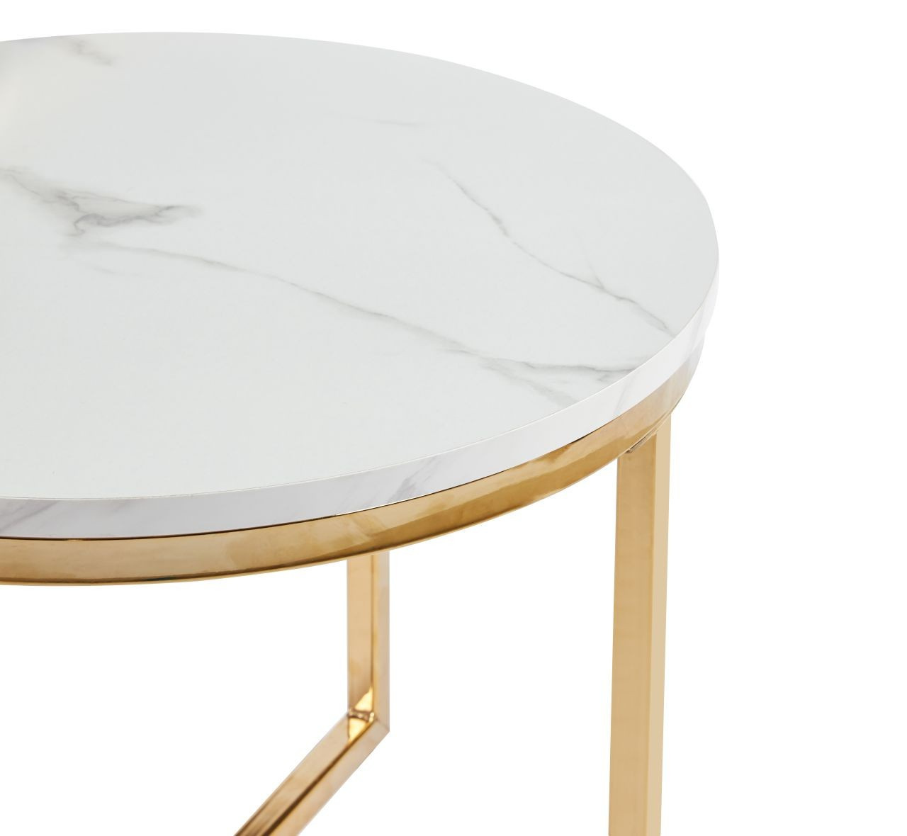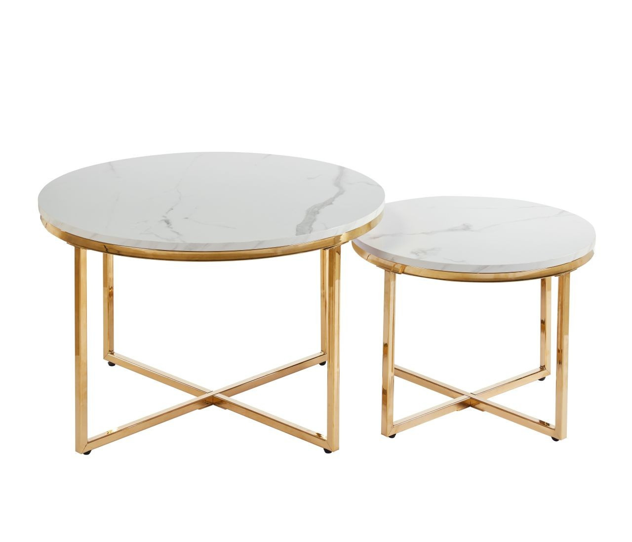 Rozměry: *větší stolek: - deska: průměr: 70 cm - výška: 45,5 cm *menší stolek: - deska: průměr 50 cm - výška: 38 cm Materiál: - deska: MDF (dýha) - nohy: chrom Barva: - deska: bílý mramor - konstrukce: zlatý lesk