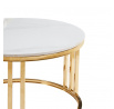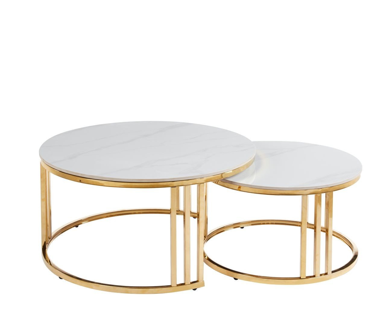 Rozměry: *větší stolek: - deska: průměr: 80 cm - výška: 40 cm *menší stolek: - deska: průměr 60 cm - výška: 35 cm Materiál: - deska: keramika - nohy: chrom Barva: - deska: bílý mramor - konstrukce: zlatý lesk