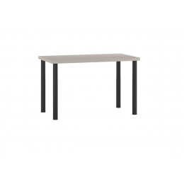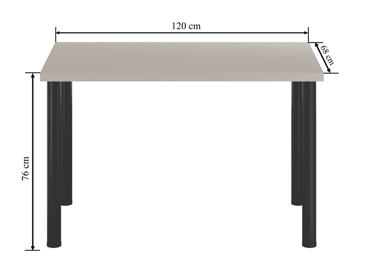 Rozměry: - délka: 120 cm - šířka: 68 cm - výška: 76 cm - tloušťka desky: 3,8 cm Materiál: - deska: laminovaná deska - hrany desky: zakončené ABS plastem - nohy: ocel lakovaná práškovou barvou Barva: - deska: kašmír - nohy: černá
