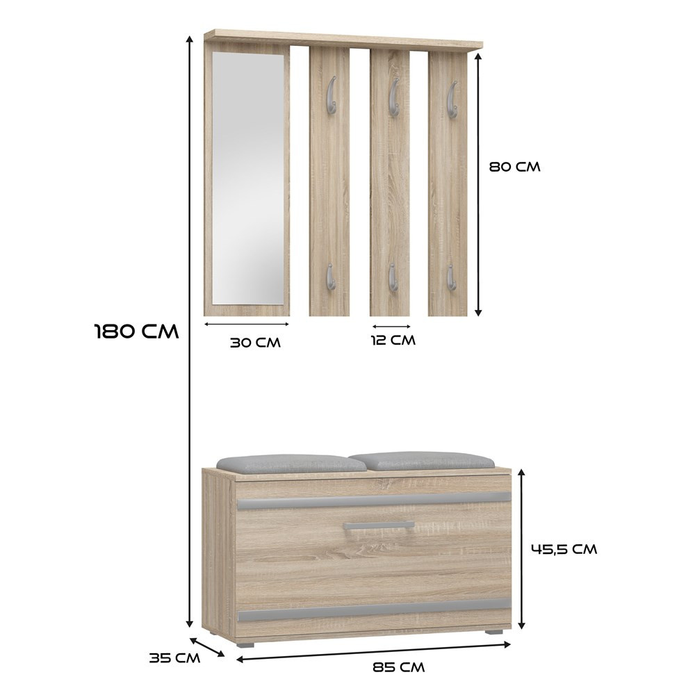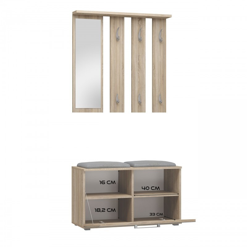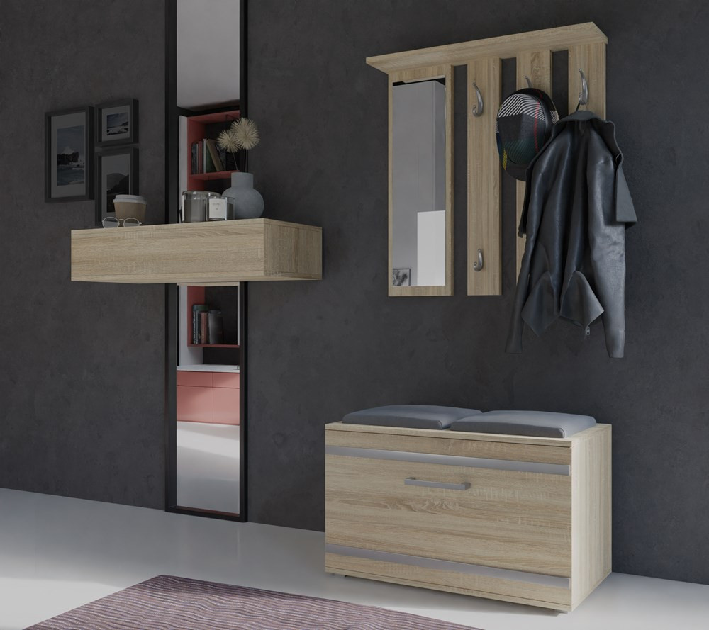 Dobře organizovaný vstupní prostor bytu se neobejde bez funkční předsíňové stěny. Předsíňová stěna do vstupní haly nabízí dostatek háčků na odložení šatstva a úložný prostor tvořený botníkem.