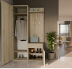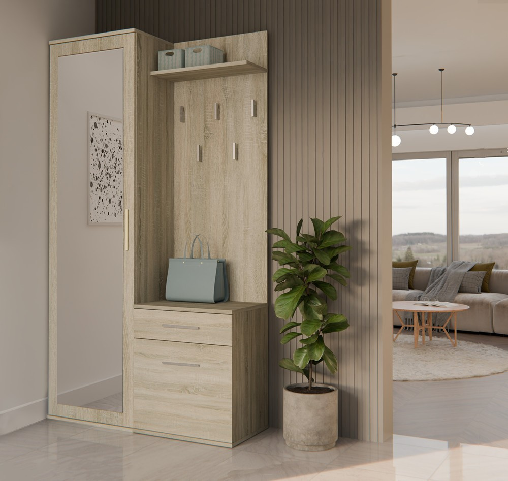 Dobře organizovaný vstupní prostor bytu se neobejde bez funkční předsíňové stěny. Předsíňová stěna Topaz do vstupní haly nabízí dostatek háčků na odložení šatstva a úložný prostor tvořený botníkem. Šatní skříň je skvělým doplňkem k předsíňové stěně Topaz. Součástí skříně jsou dvě police a výsuvný věšák, díky tomu poskytují dostatek úložného prostoru. Předsíňová stěna je dodávána v demontu a součástí je montážní plánek včetně všech potřebných spojovacích materiálů.