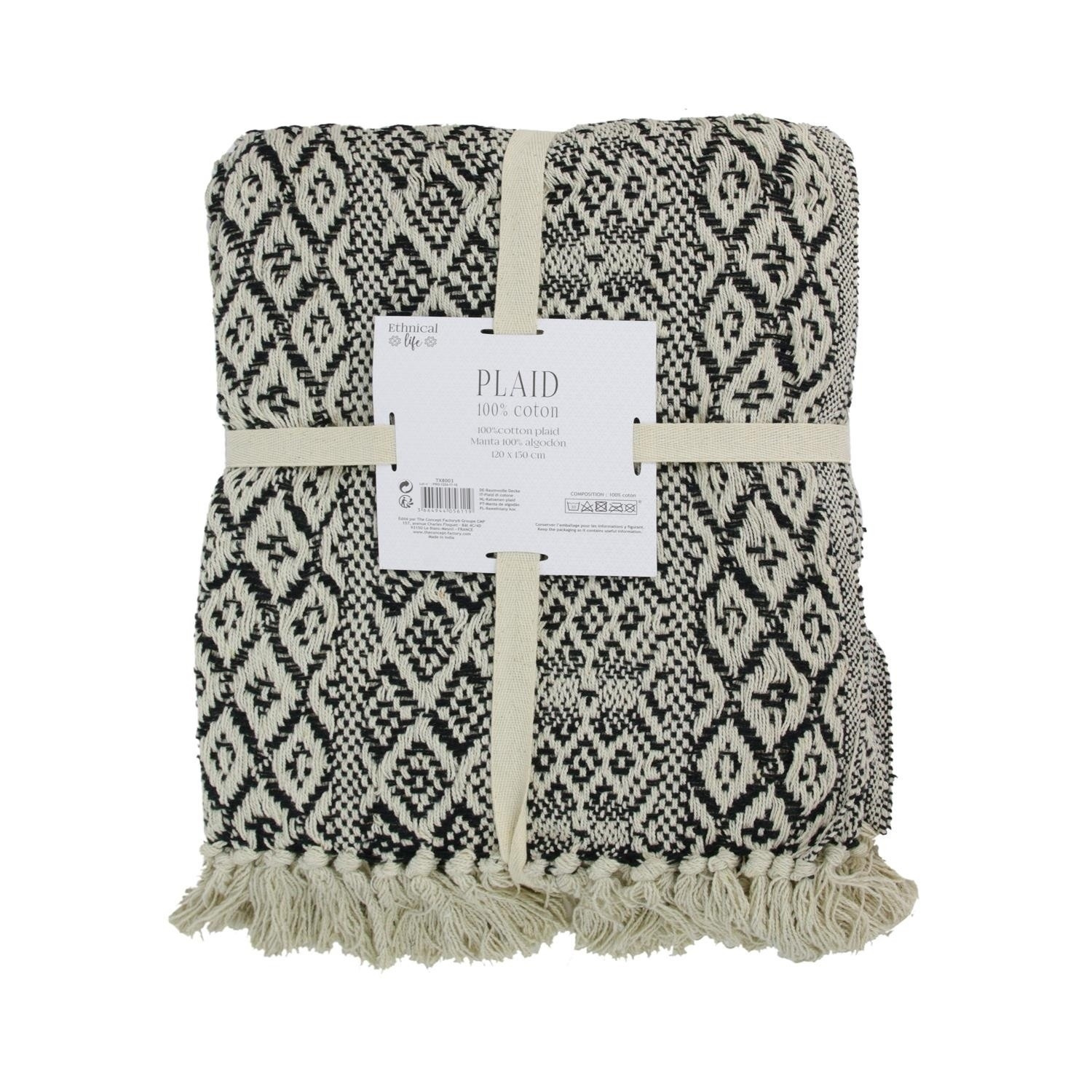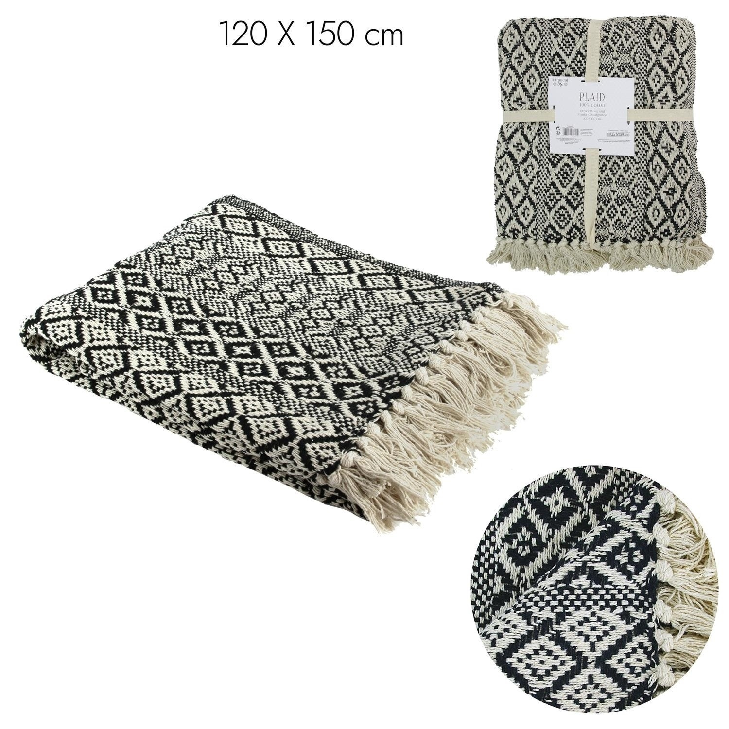 Přehoz vyrobený ze 100% bavlny se hodí do interiéru v orientálním stylu. Černobílý vzor deky doplňují třásně na okraji.