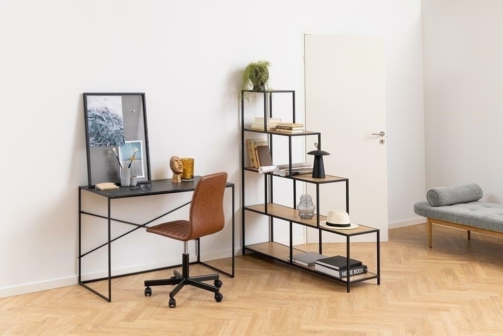 Regál schodový Seaford je nábytek s velmi neobvyklou formou, díky které je zajímavou ozdobou interiéru. Hodí se do kanceláře, obývacího pokoje a také dětského pokoje. Kostra regálu je vyrobena z kovu lakovaného práškovou barvou na černo. Výhodou regálu jsou čtyři dlouhé police z MDF desky s dýhou a jedna kratší na samém vrchu. Geometrický tvar schodů umožňuje esteticky vystavit rostliny, suvenýry nebo fotografie na regálu. Regál stojí na čtyřech nohách opatřených zespodu ochrannými krytkami. Počet kartonů: 1 Rozměry kartonů: 154,5x38x11,9cm Hmotnost kartonů: 21kg