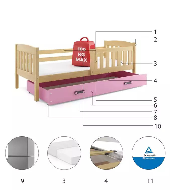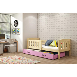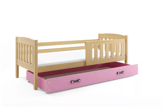 Dětská postel KUBUS 80x160 cm se šuplíkem, s matrací, Přírodní/Růžová