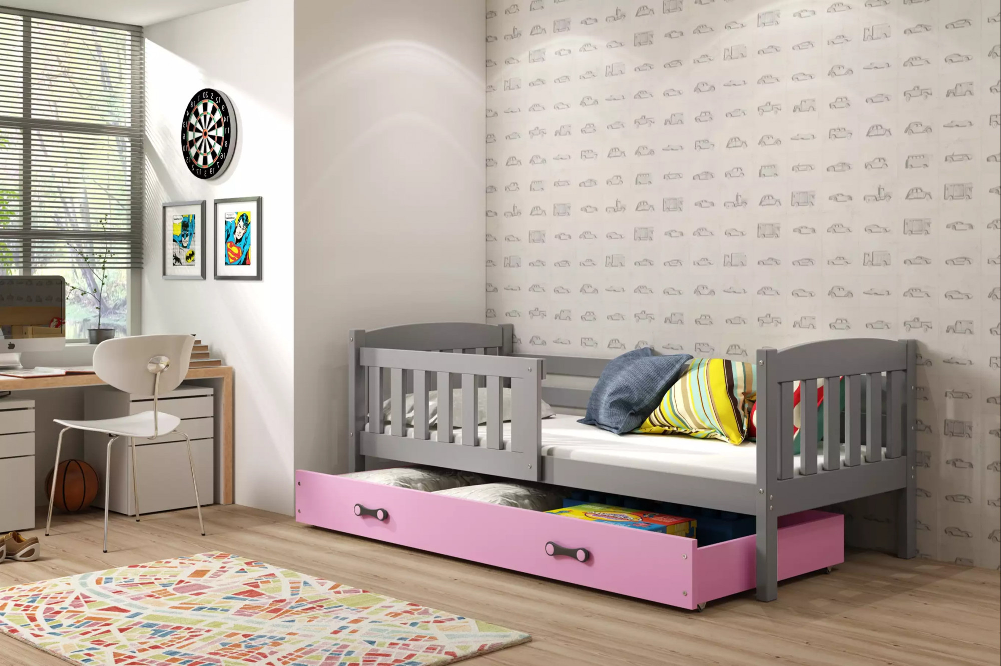 Dětská postel KUBUS 80x160 cm se šuplíkem, s matrací, Grafit/Růžová