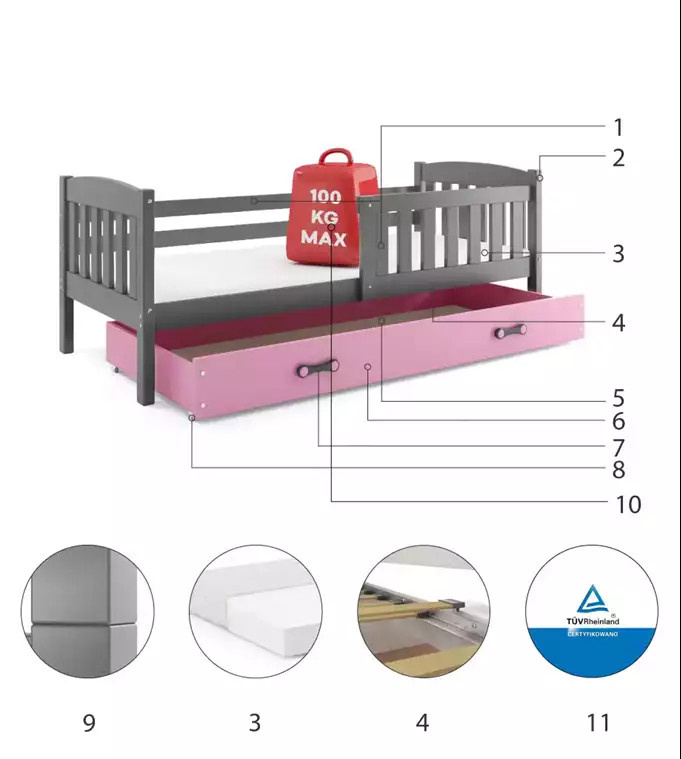 Dětská postel KUBUS 90x200 cm se šuplíkem, s matrací, Grafit/Růžová