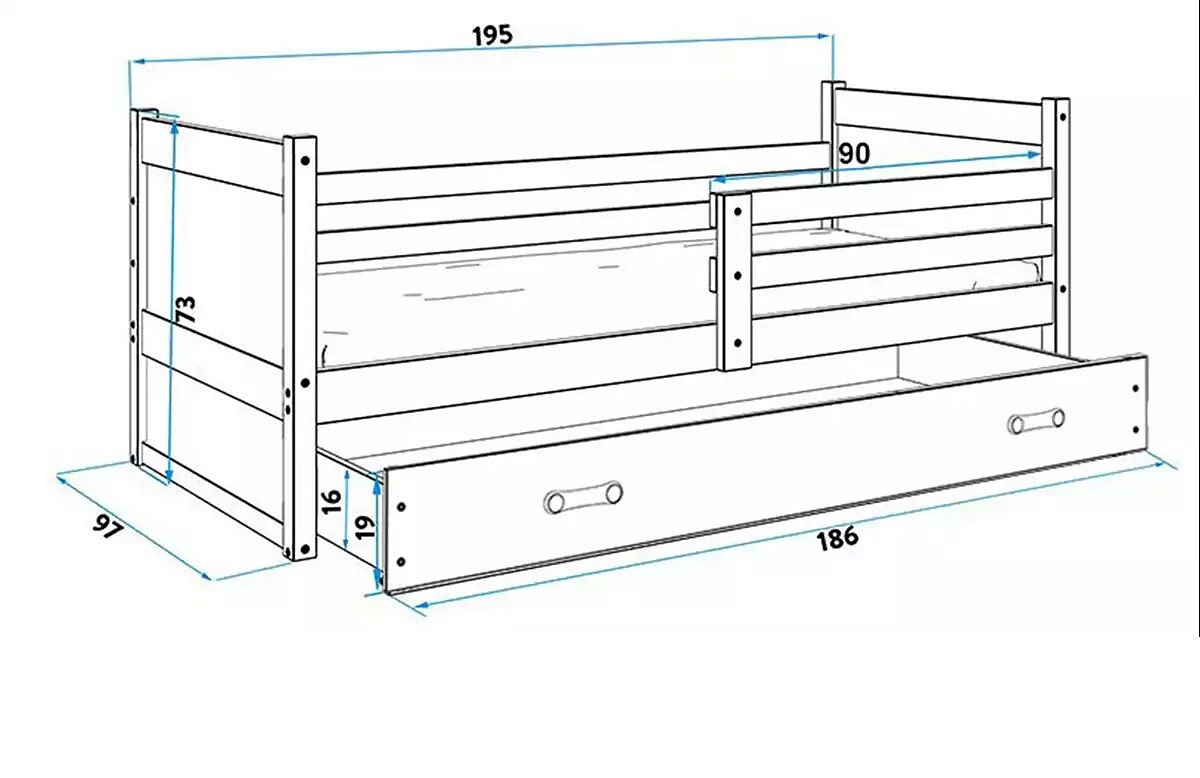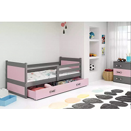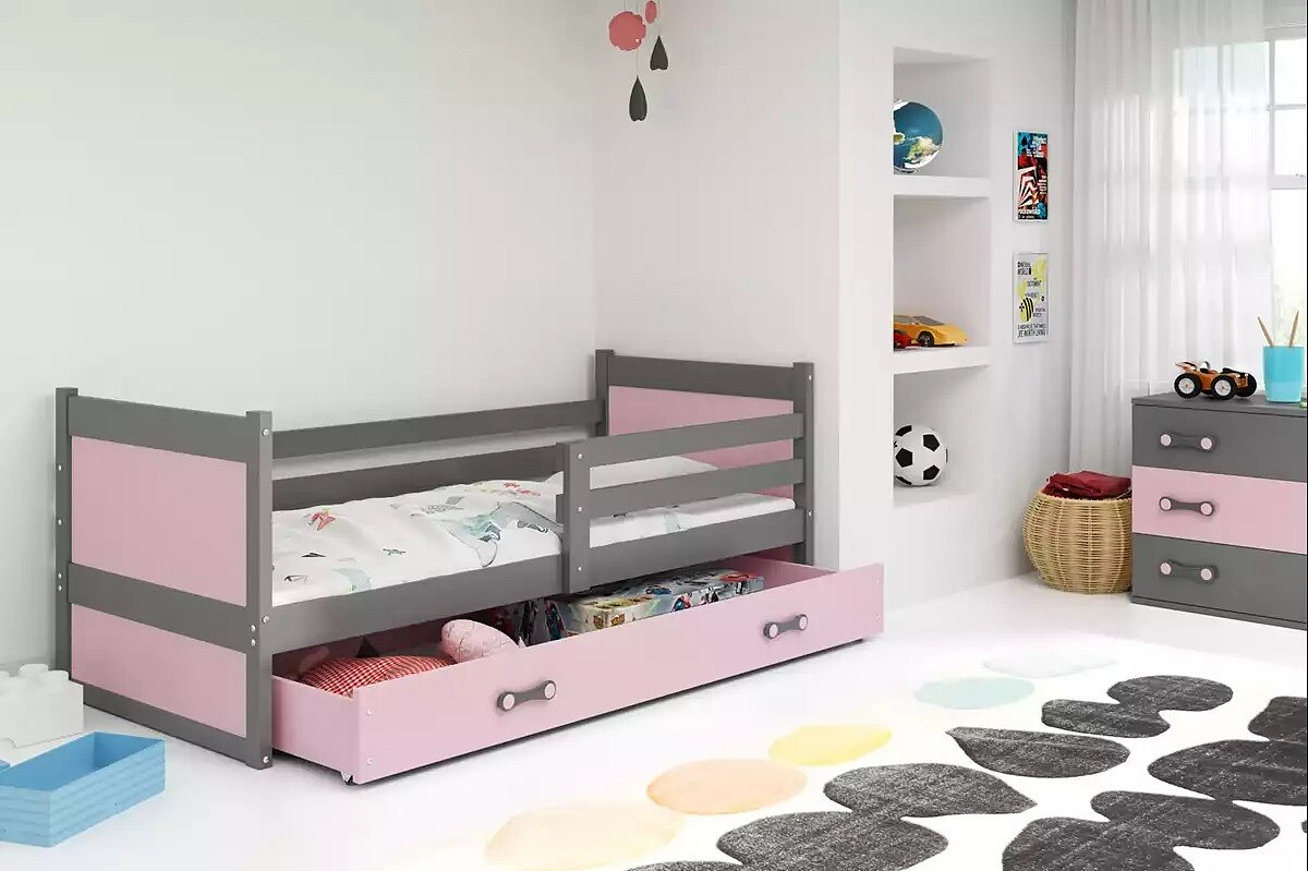 Dětská postel RICO 90x200 cm se šuplíkem, bez matrace, Grafit/Růžová