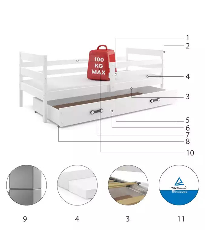 Dětská postel ERYK 90x200 cm se šuplíkem, bez matrace, Bílá/Bílá