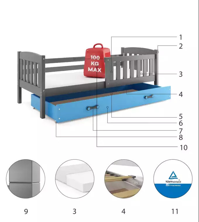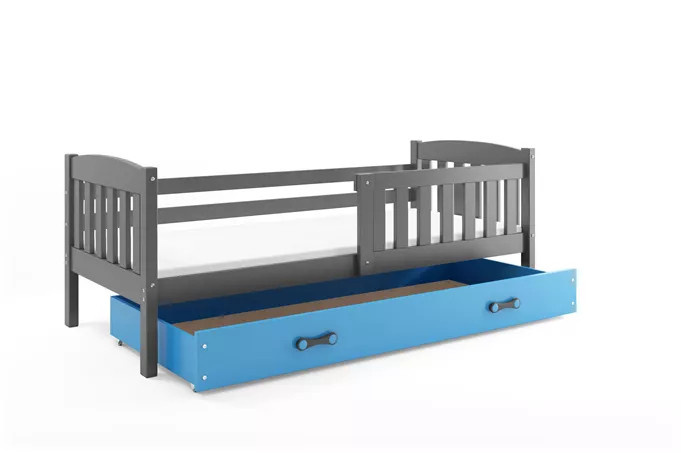 Dětská postel KUBUS 90x200 cm se šuplíkem, s matrací, Grafit/Modrá