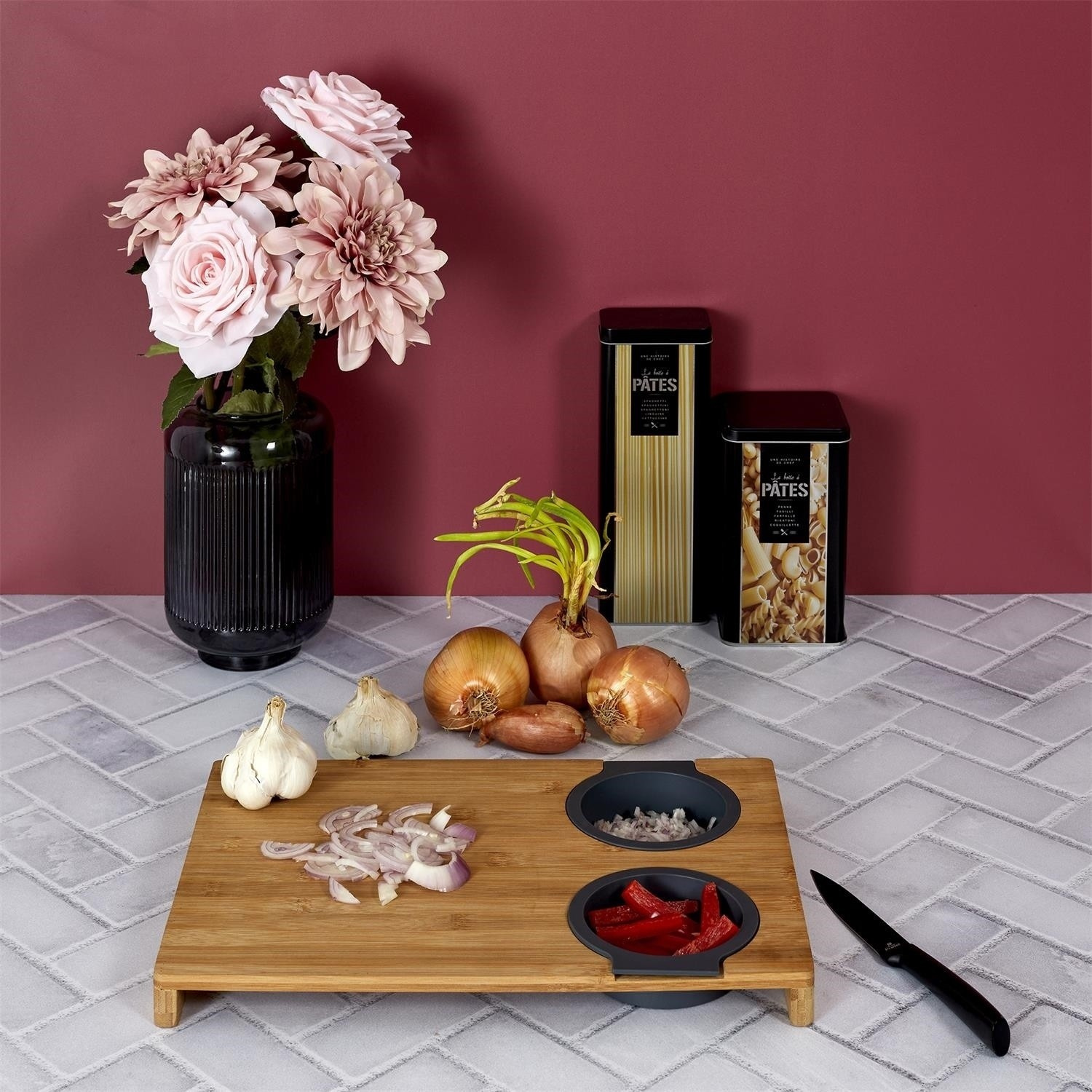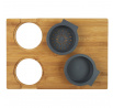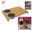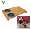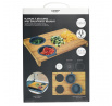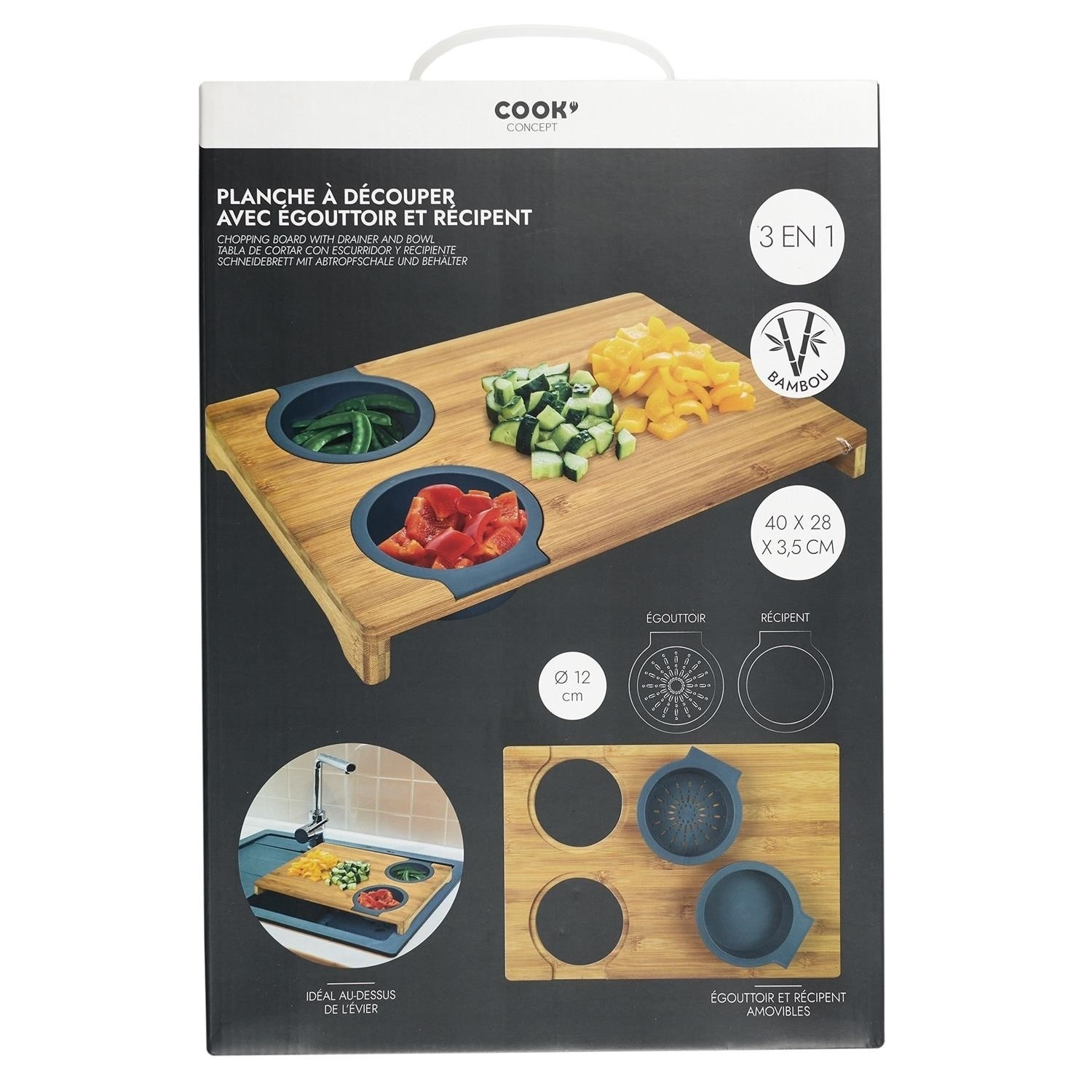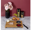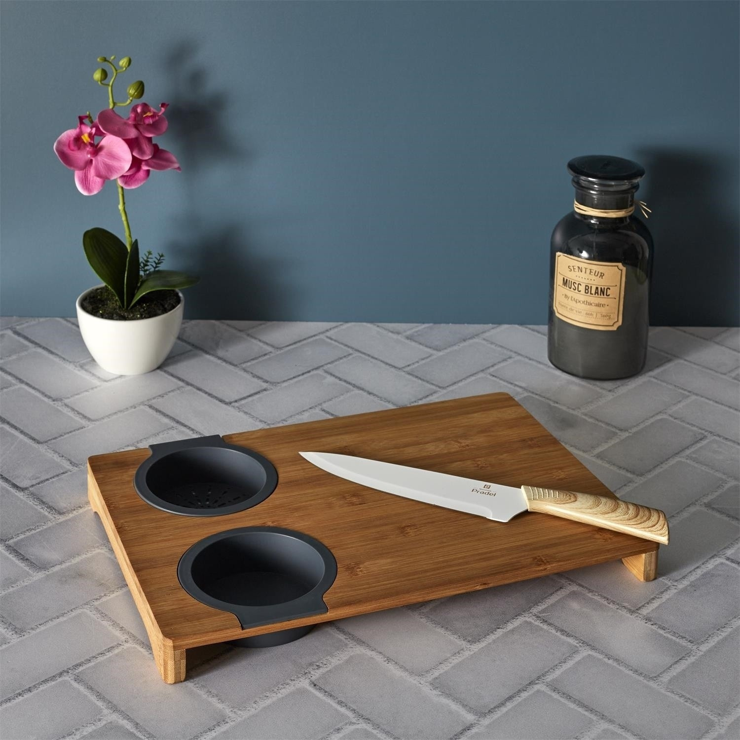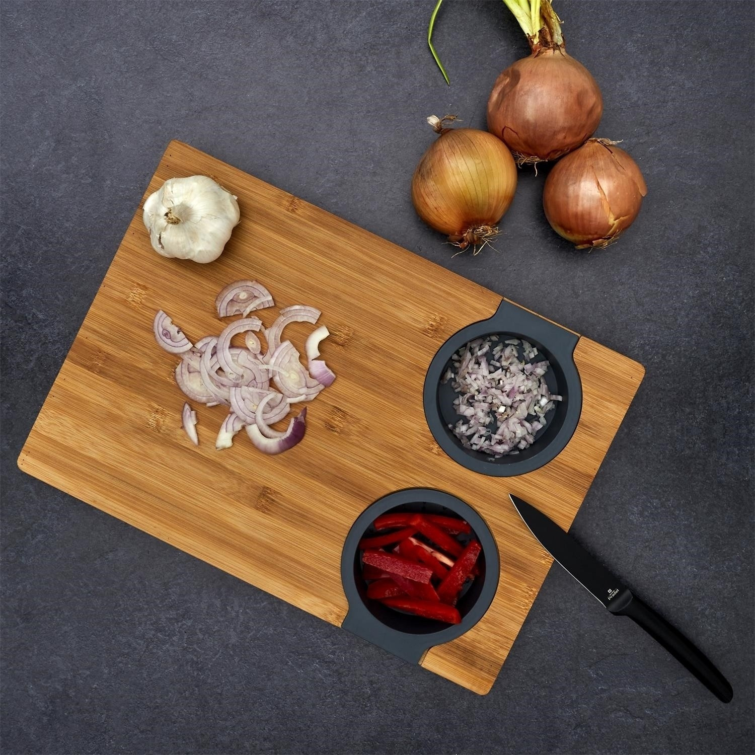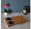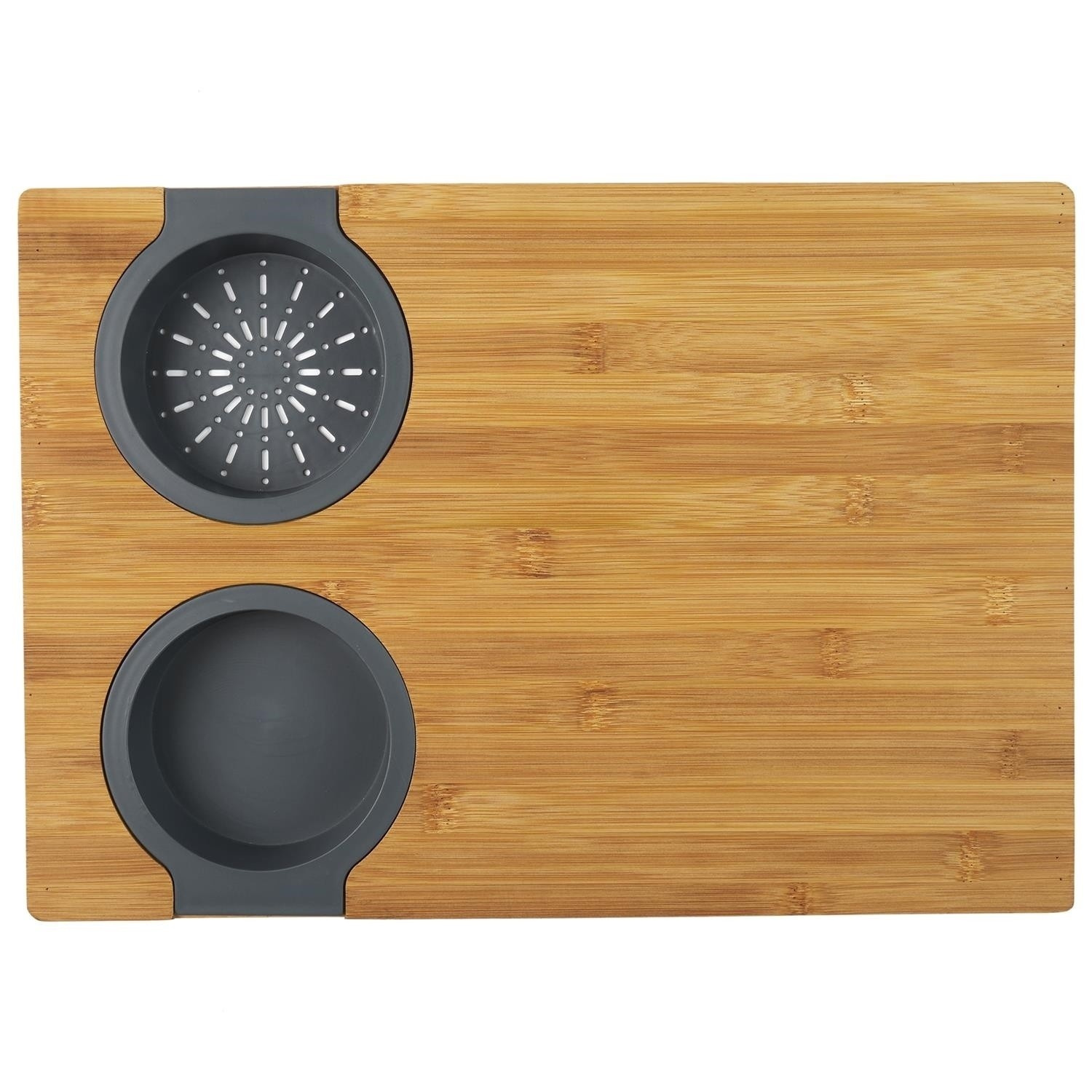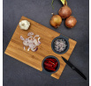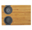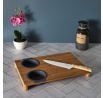 Prkénko na krájení s vestavěnými dvěma silikonovými nádobkami. Deska ideální na krájení kvašených okurek nebo šťavnatého ovoce. Nakrájenou zeleninu a ovoce můžeme přeložit do jedné ze dvou vestavěných silikonových přihrádek. Jedno je sítko, které scedí naše jídlo od přebytečné omáčky, a druhá nádobka je miska, která šťávu uchová. Samotná deska byla vyrobena z bambusového dřeva. Bambus se vyznačuje odolností vůči vlhkosti a tvrdou a trvanlivou strukturou, která vydrží časté krájení nožem.