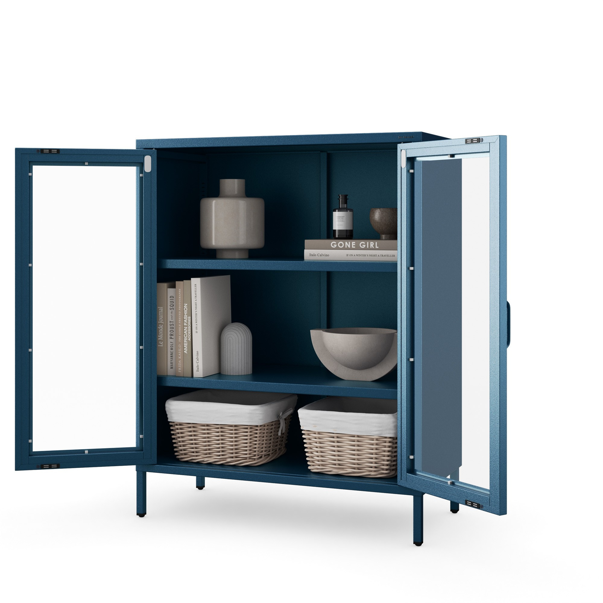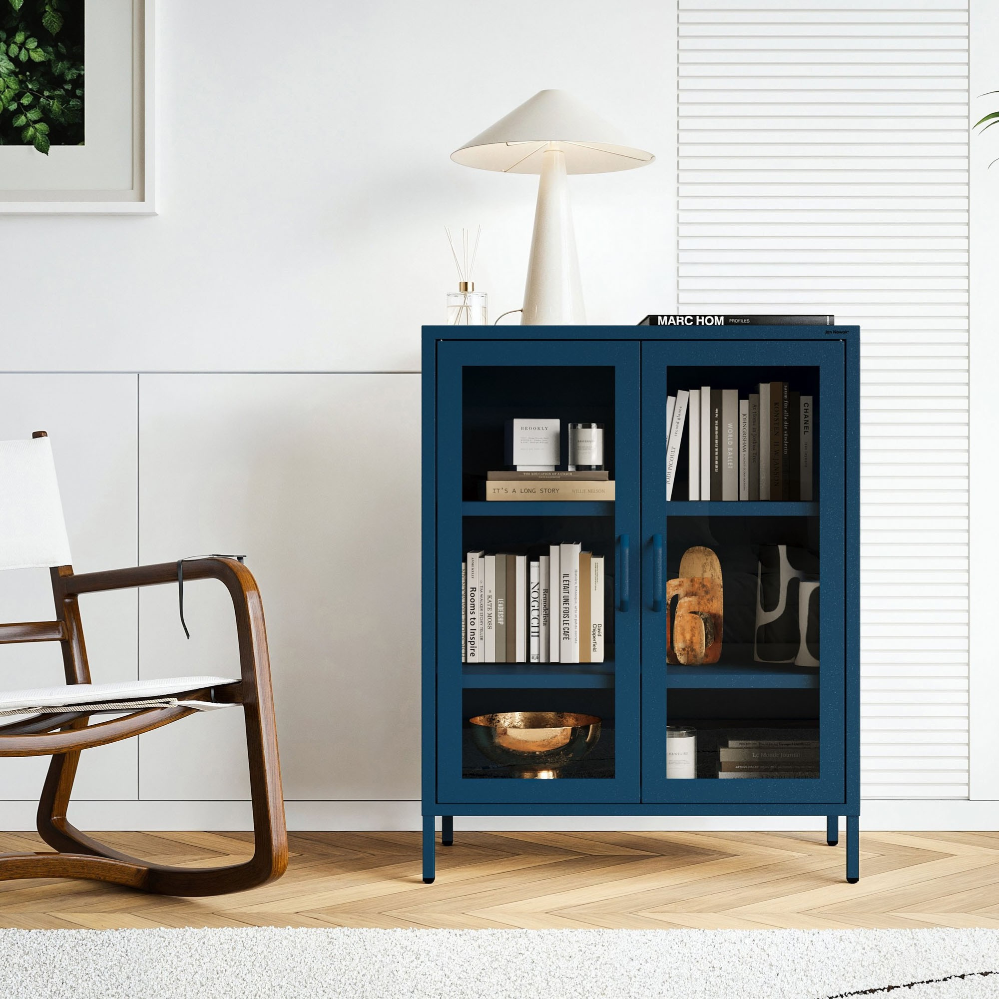 Vnitřní prostor vitríny je rozdělen dvěma nastavitelnými policemi, jejichž výšku si můžete přizpůsobit podle svých potřeb. Police jsou dostatečně pevné, aby unesly i těžší předměty, jako jsou například knihy nebo keramika.