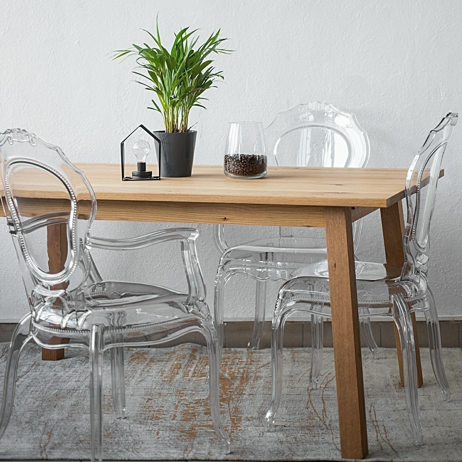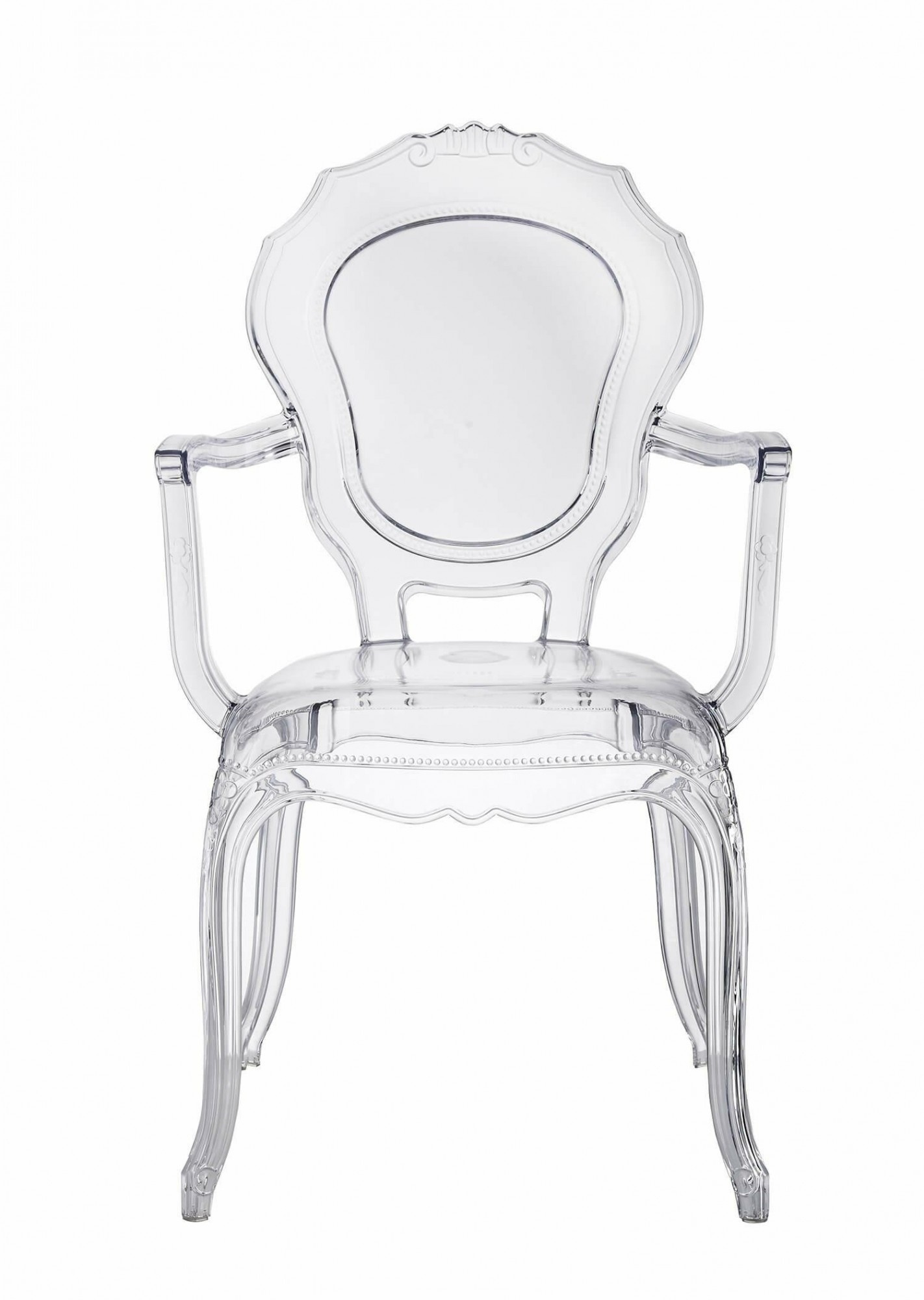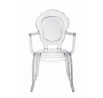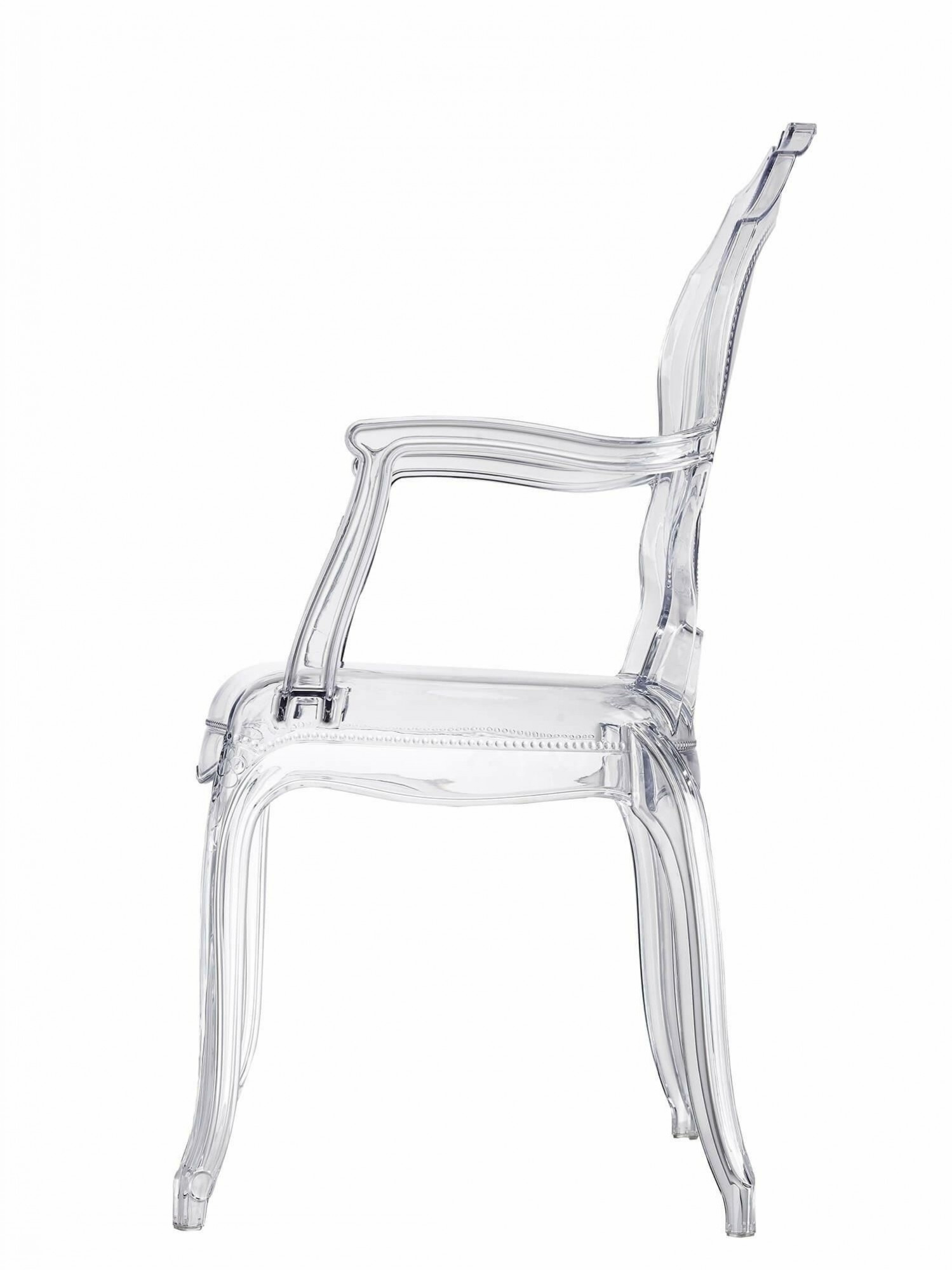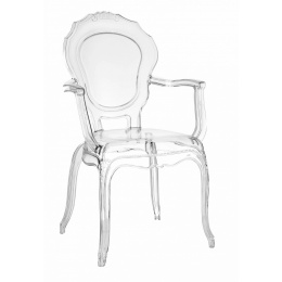 Moderní průhledná židle Queen Arm je dokonalá forma uzavřená v užitkovém nábytku. Transparentní židle Queen je vyrobena z materiálu s lesklou povrchovou úpravou, což zajišťuje, že její údržba v čistotě nebude představovat žádný problém. Křeslo s područkami bylo vyrobeno ve stylu Glamour. Ozdobné zakončení na základně židle, područkách i na horní části jejího sedadla činí židli mimořádně designovou a moderní. Průhledná židle Queen se skvěle hodí jako židle pro různé slavnostní příležitosti, židle do jídelny nebo také židle.
