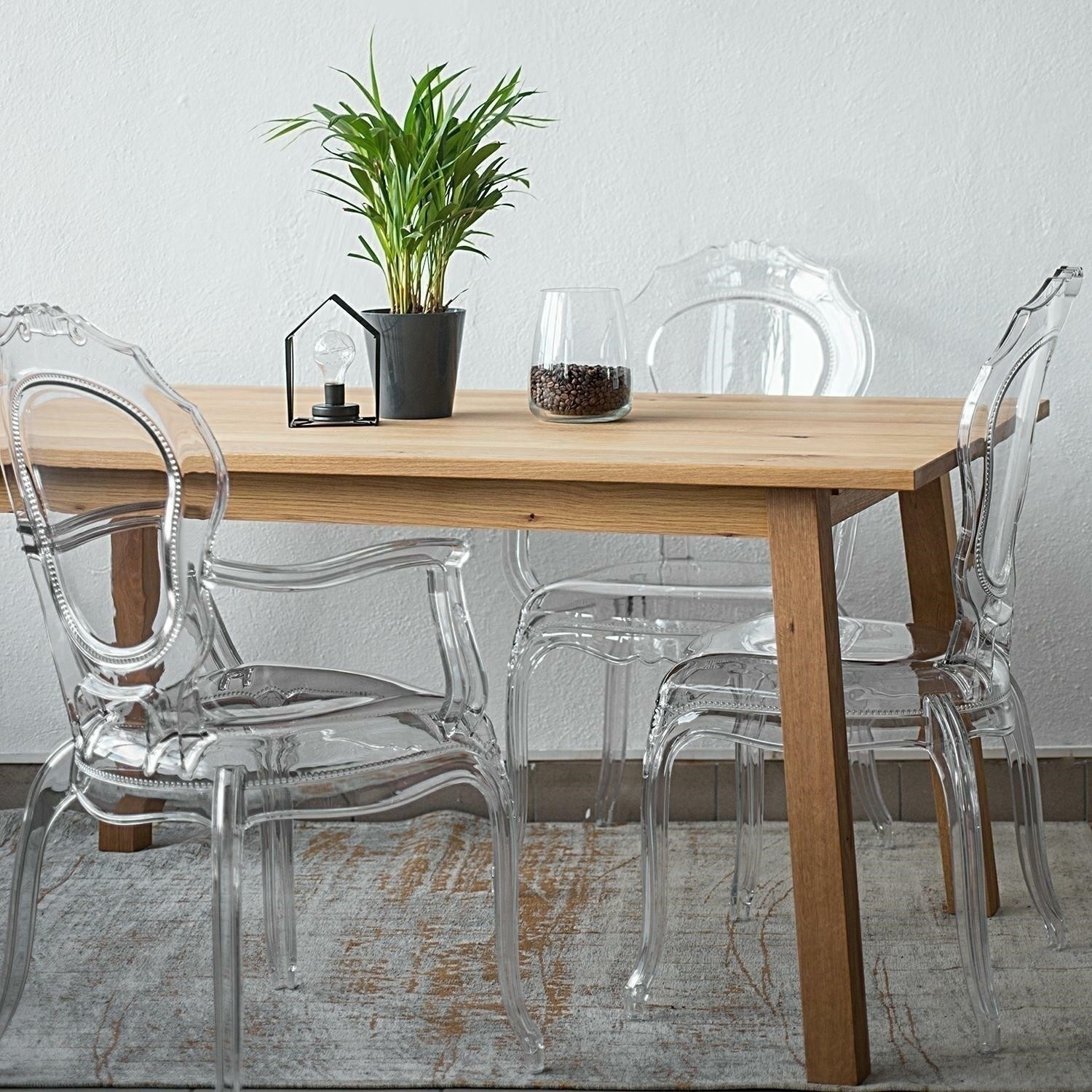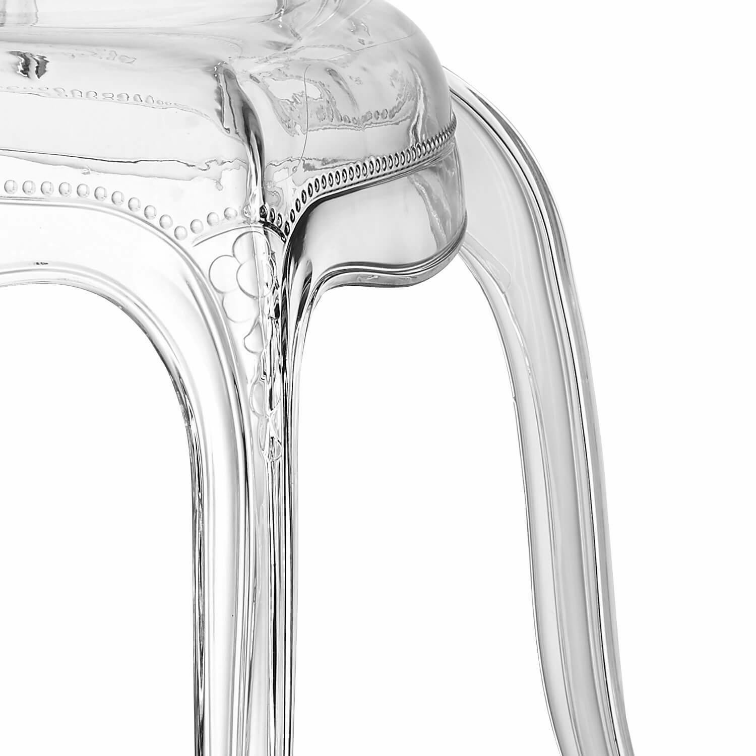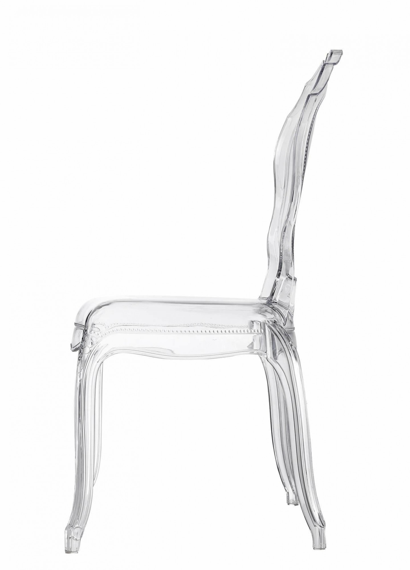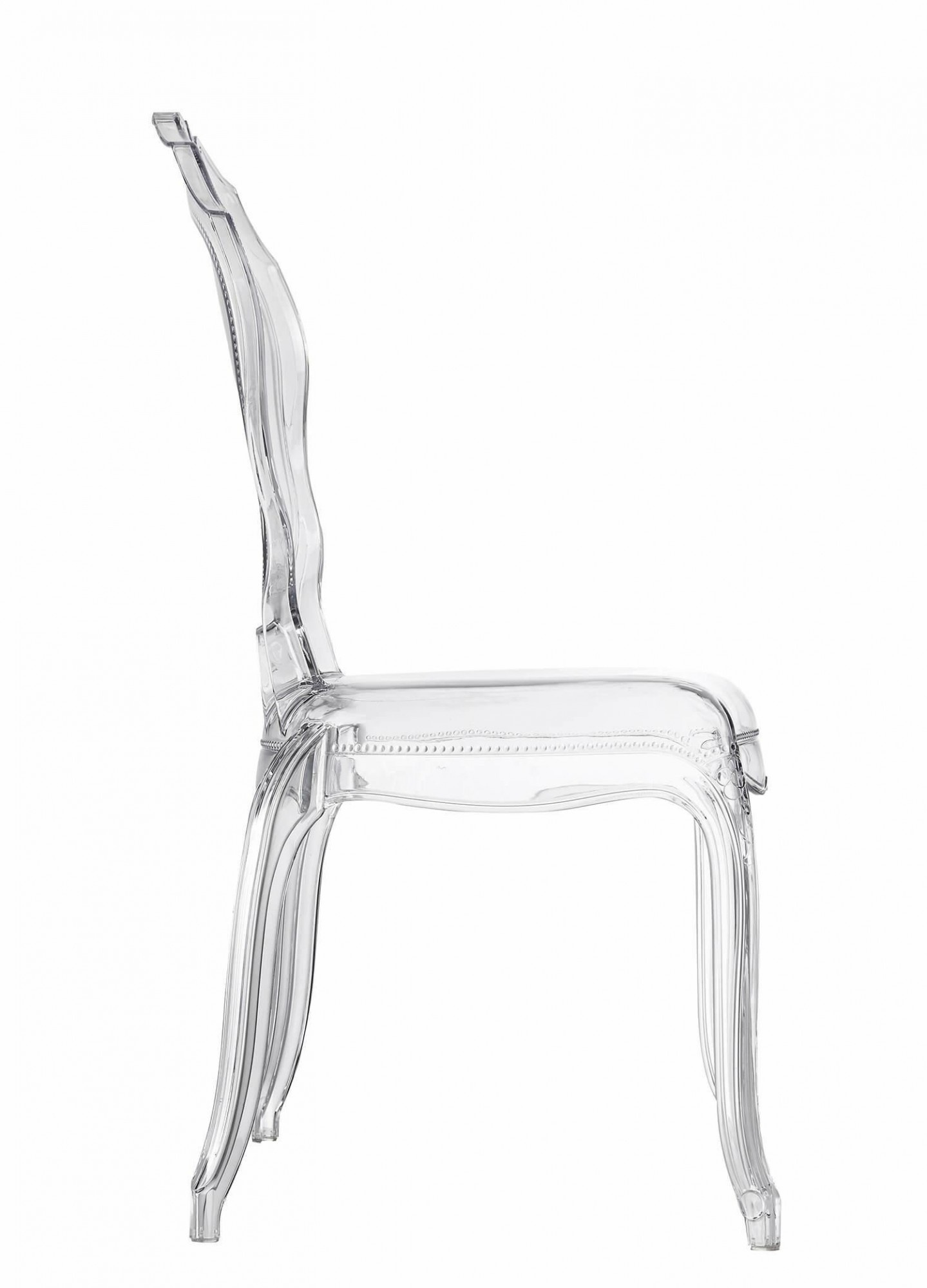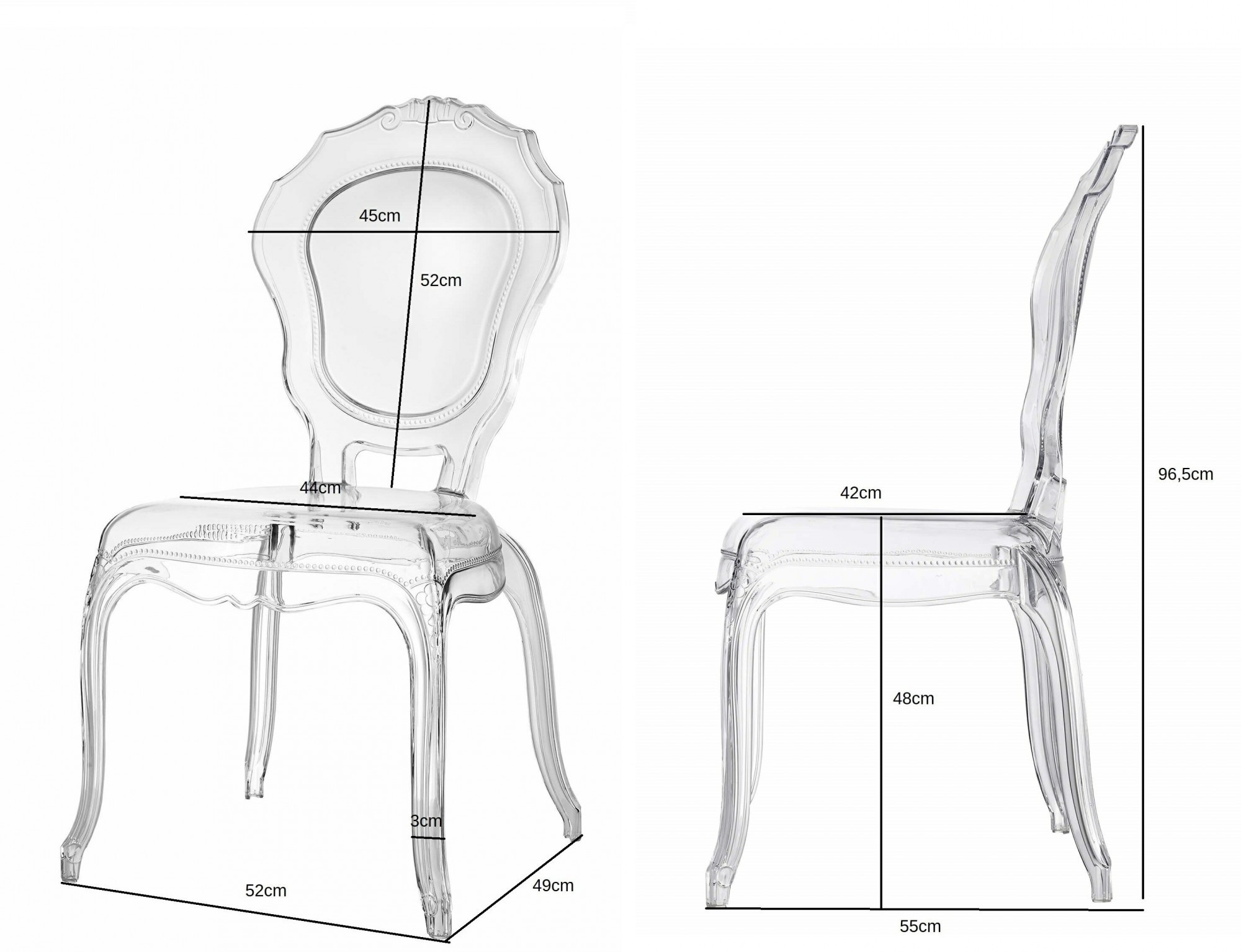 Moderní transparentní židle Queen je dokonalá forma uzavřená v užitkovém nábytku. Transparentní židle Queen je vyrobena z materiálu s lesklou povrchovou úpravou, což zajišťuje, že její údržba v čistotě nebude představovat žádný problém. Židle byla vyrobena ve stylu Glamour. Ozdobné zakončení na základně židle i na horní části jejího sedadla činí židli mimořádně designovou a moderní. Průhledná židle Queen se skvěle hodí jako židle pro různé slavnostní příležitosti, židle do jídelny nebo židle k psacímu stolu. Židle lze stohovat, n