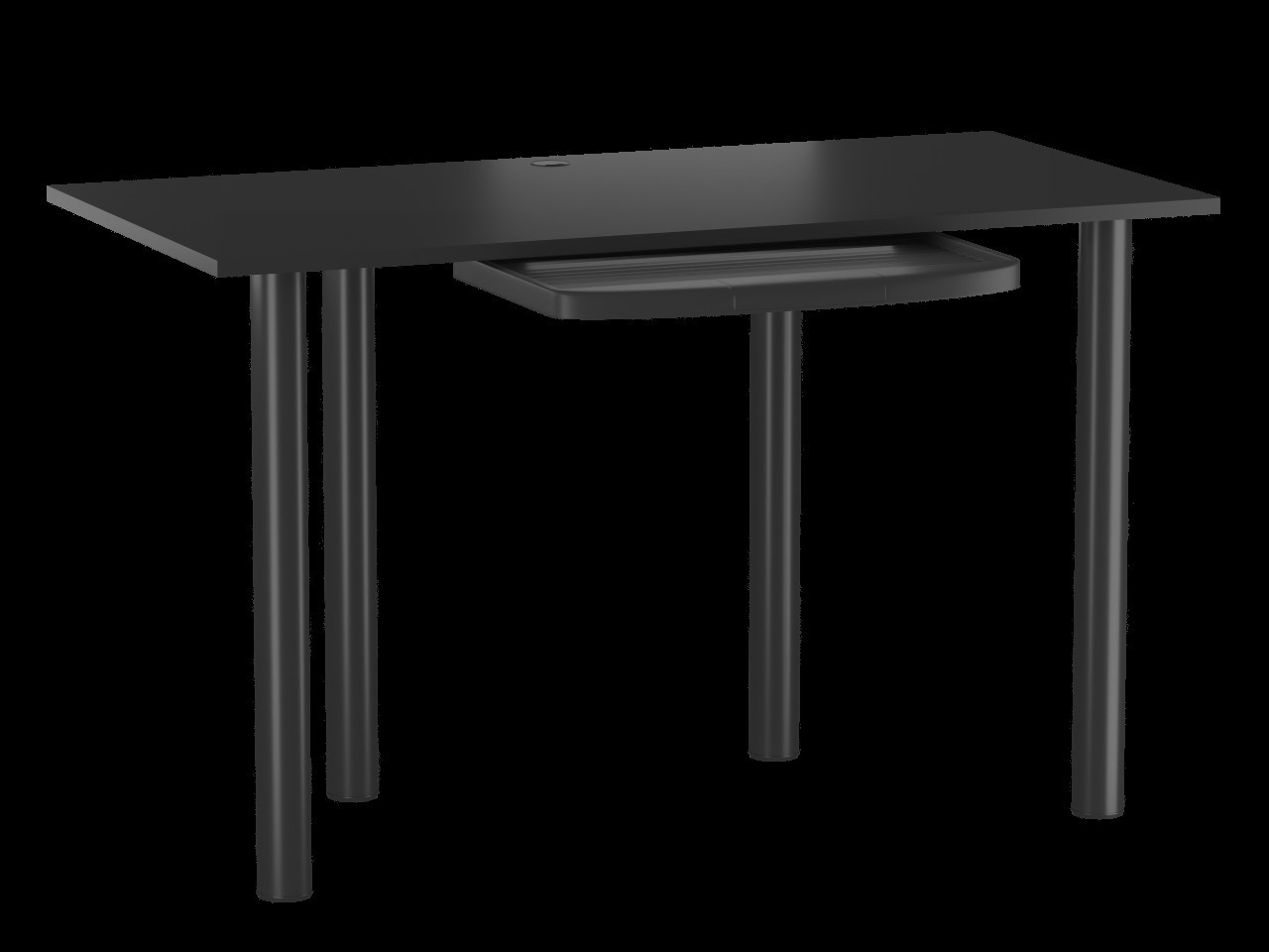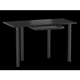 MATERIÁL: Deska - laminovaná dřevotřísková deska 18 mm Hrany – zakončené ABS plastem Nohy - kov lakovaný práškovou barvou Výsuvná police na klávesnici - PP plast ROZMĚRY: Hloubka: 60 cm Šířka: 120 cm Výška: 73 cm (+ regulace 5 cm) BARVA Deska - černá Nohy - černé