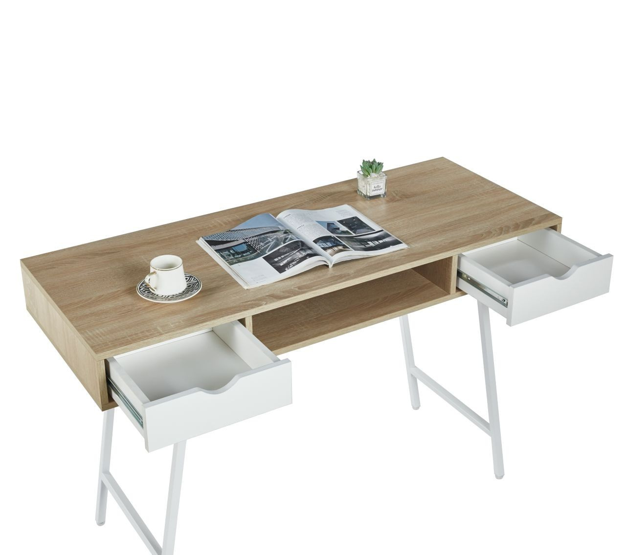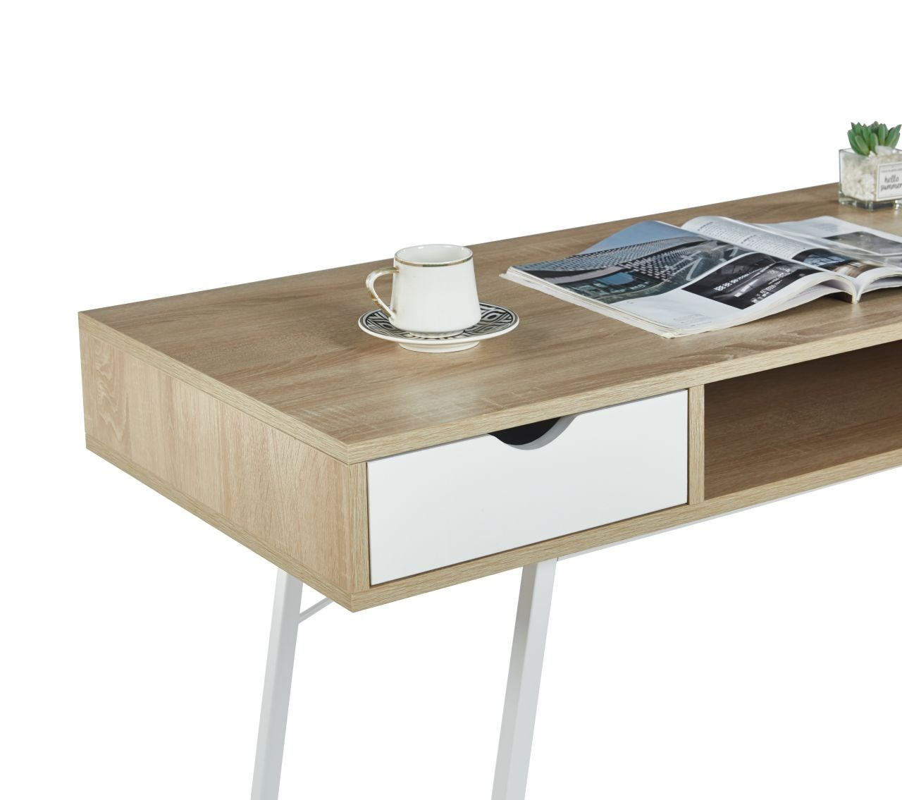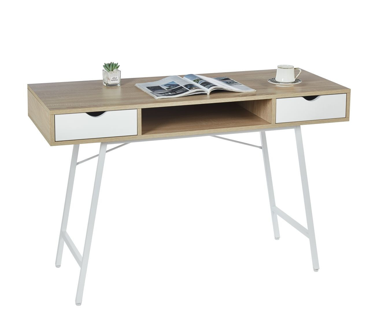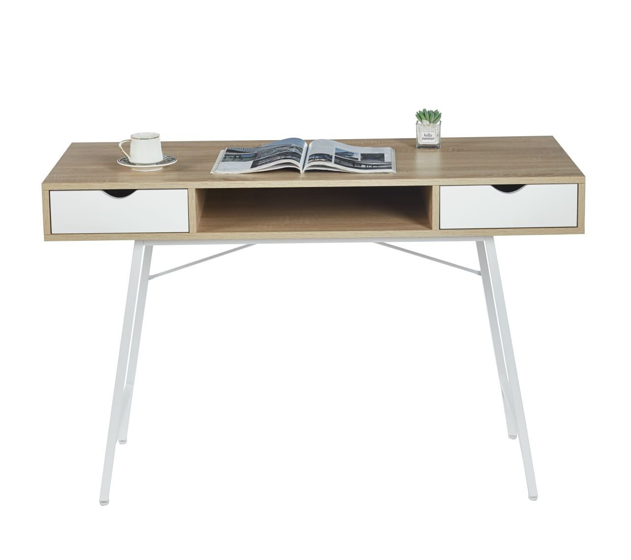 ROZMĚRY: - hloubka: 41 cm - šířka: 102 cm - výška: 77 cm MATERIÁL: - korpus: laminovaná dřevotříska - rám: kov lakovaný práškovou barvou BARVA: - korpus: dub sonoma + bílá - rám: bílá OSTATNÍ: - dvě zásuvky + otevřená police