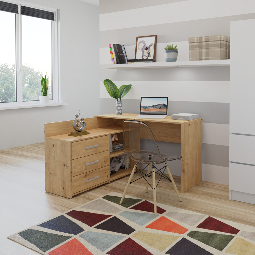Funkční psací stůl Dado v jednoduchém a moderním designu poskytuje pohodlnou pracovní plochu a díky vestavěné komodě také spoustu úložného prostoru. Je vyrobený ze snadno udržovatelného lamina, hrany jsou zakončené vysoce odolným ABS materiálem.