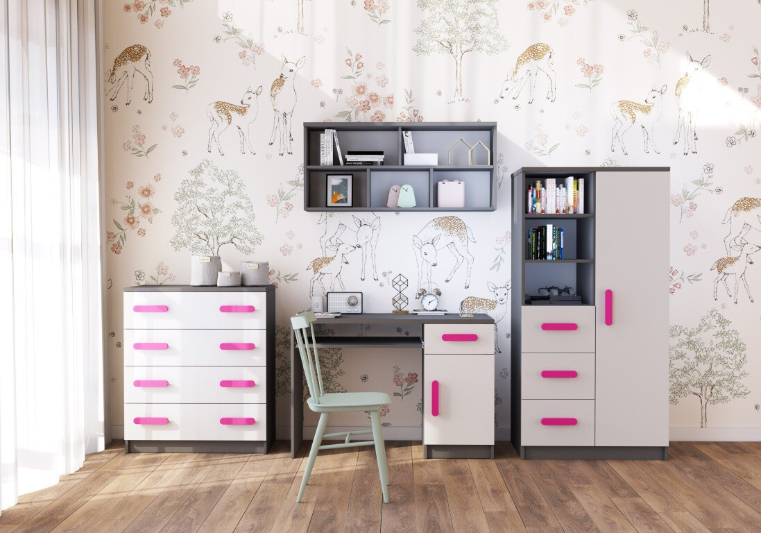 Moderní řada nábytku SMYK II potěší svou jednoduchostí a elegancí, kombinující klasickou šedou barvu korpusu a bílou barvou čel. Dalším prvkem, který odlišuje "Smyk II", jsou ozdobné dřevěné úchytky, které jsou k dispozici v různých barvách. Právě ty dodávají nábytku charakter a vytvářejí v dětském pokoji jedinečnou a jemnou atmosféru.