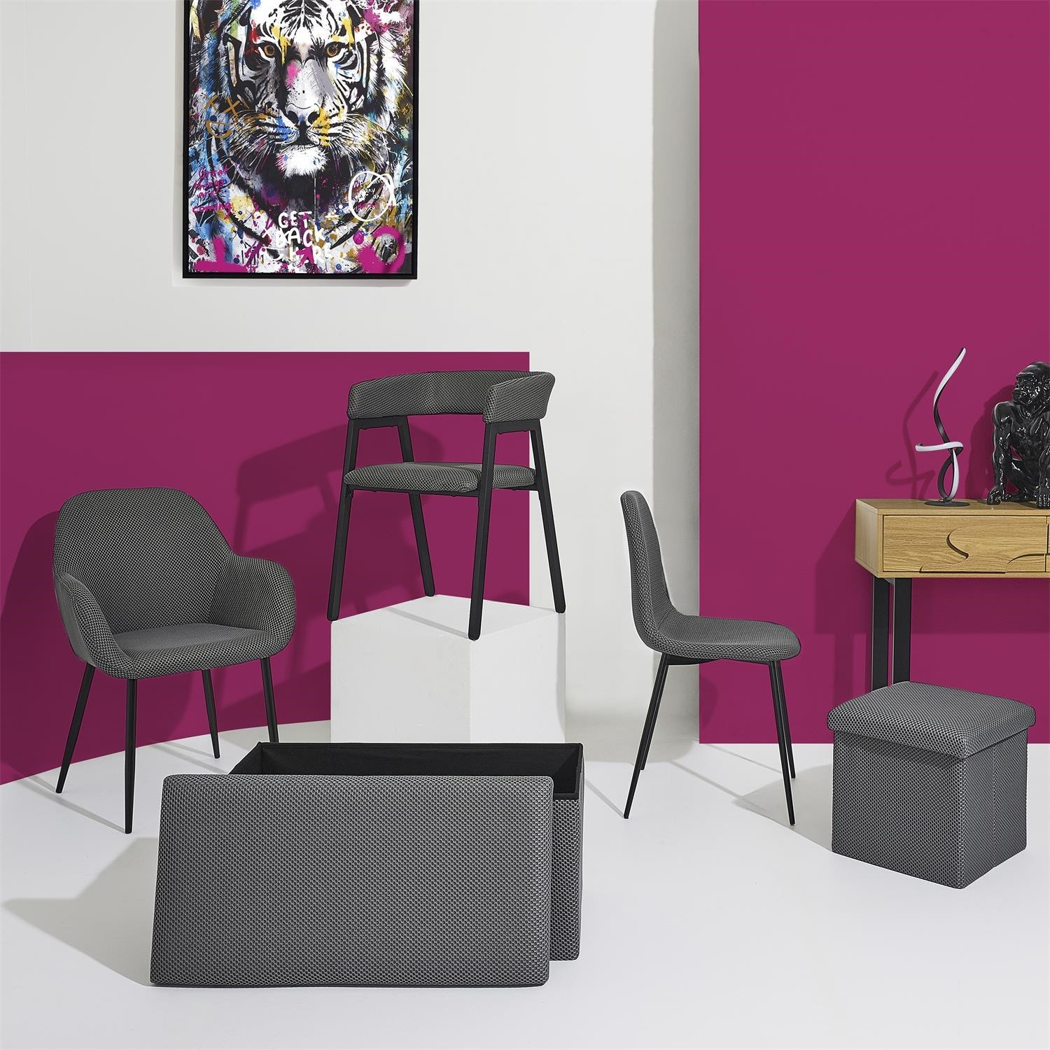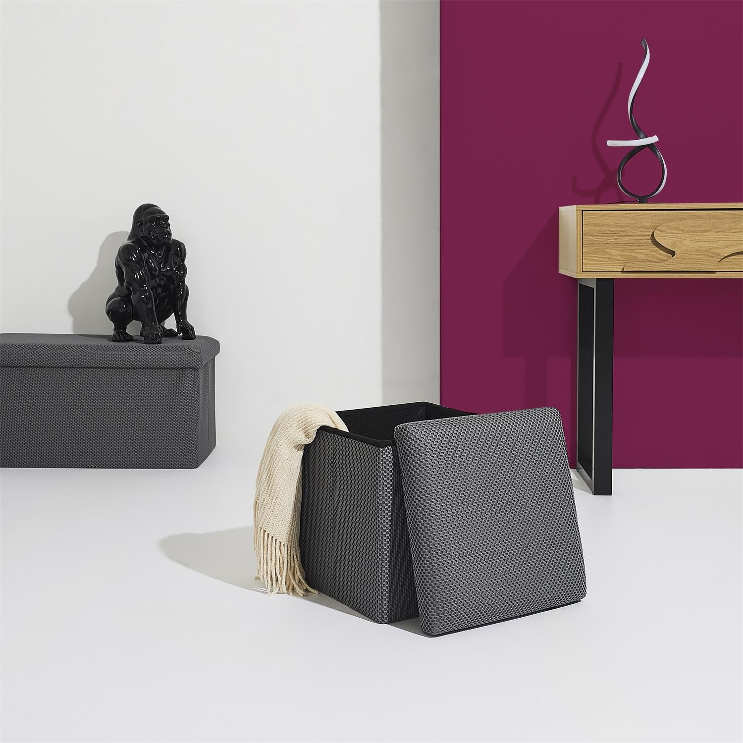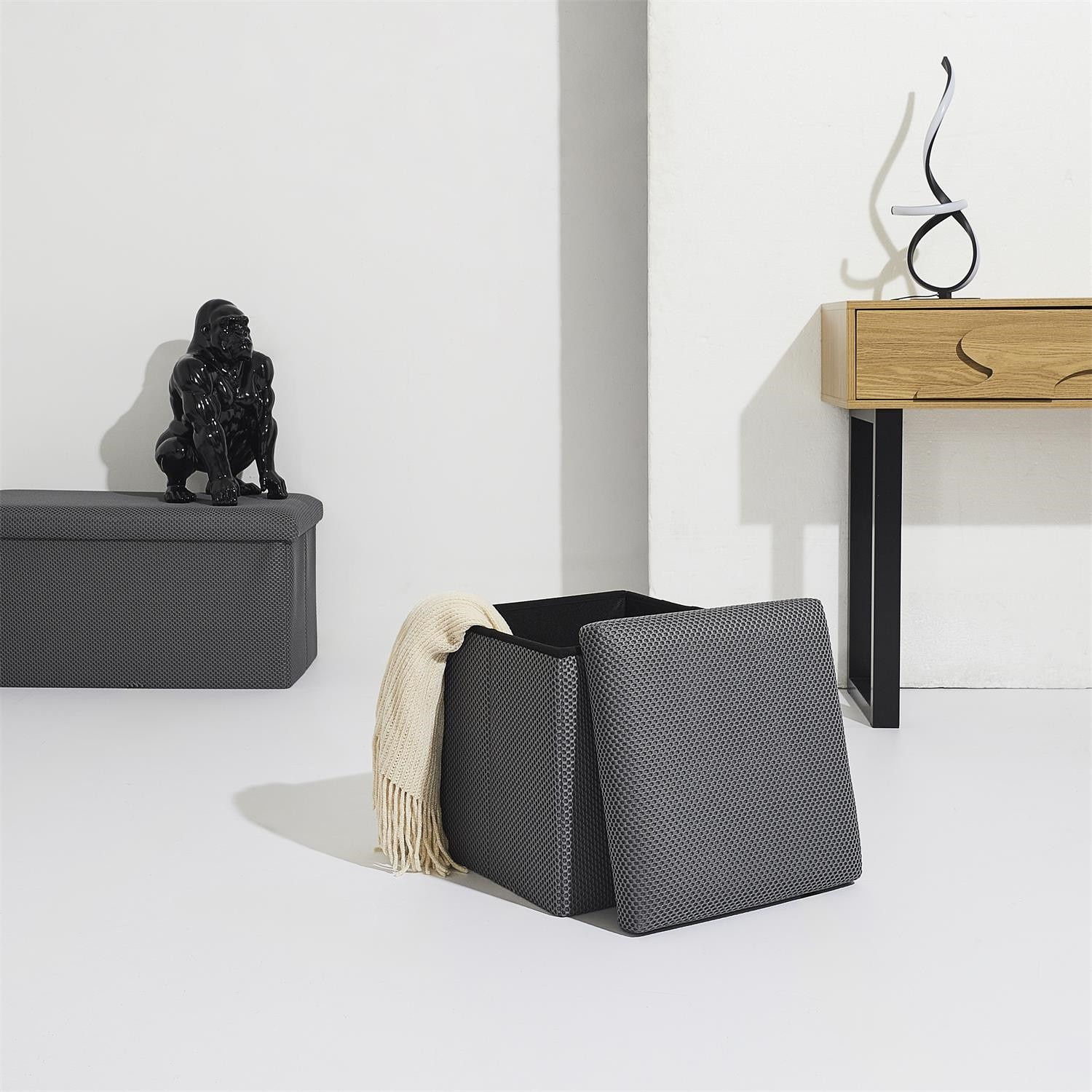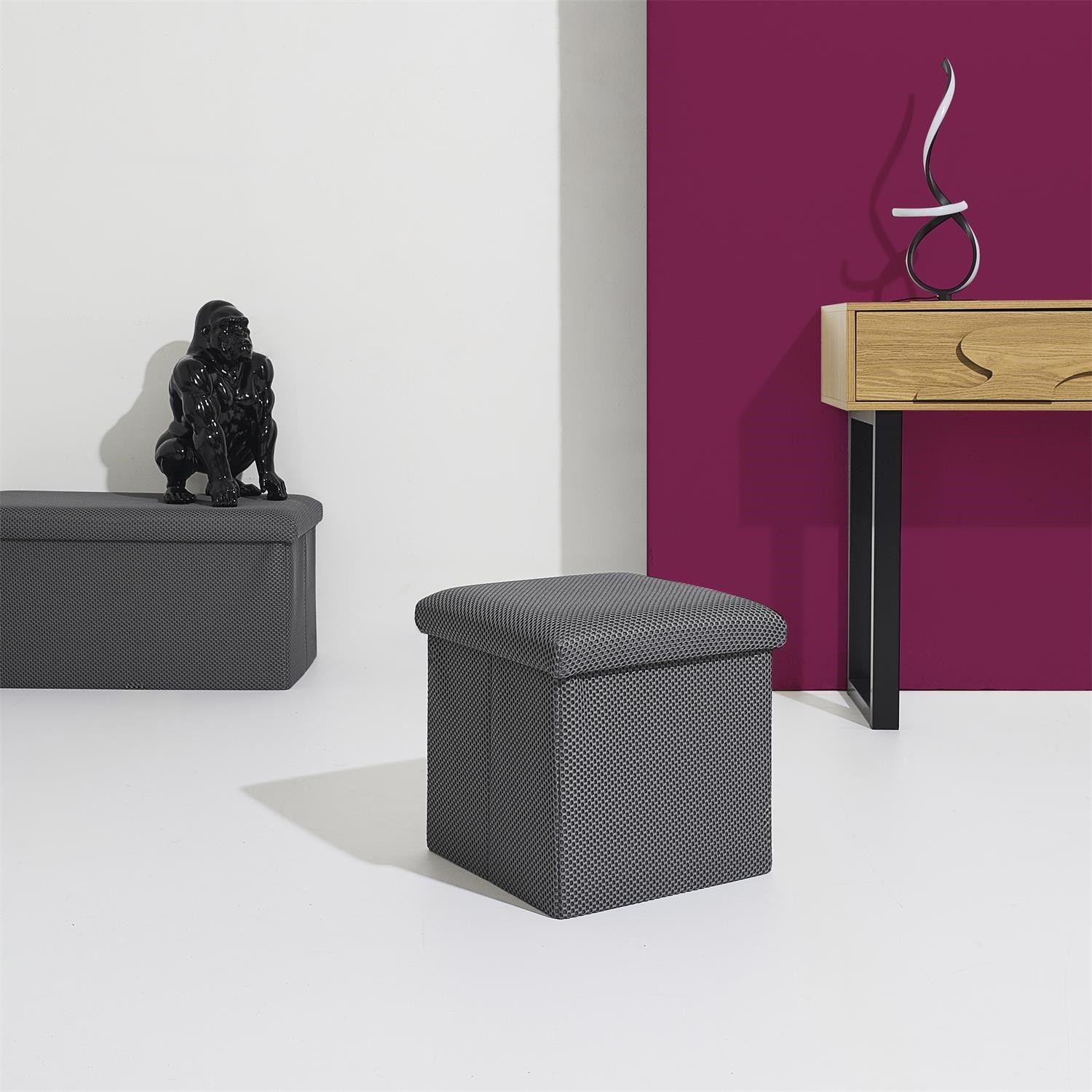 Skládací puf s úložným prostorem je nutností každého studentského bytu nebo pro osoby, které potřebují další místo k sezení a úložný prostor. Puf vyrobený z rámu z odolné MDF desky, která zaručuje maximální přípustné zatížení nábytku až do 110 kg. Puf lze složit, když ji nepoužíváme. Po rozložení nám poskytuje spoustu místa pro uložení jak menších věcí, tak i větších, jako jsou deky, boty nebo knihy. Puf byl ozdoben zajímavou trojrozměrnou tkaninou. Tkanina 100% polyester.