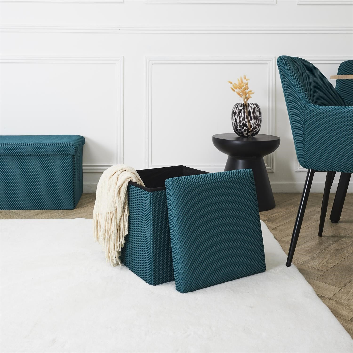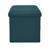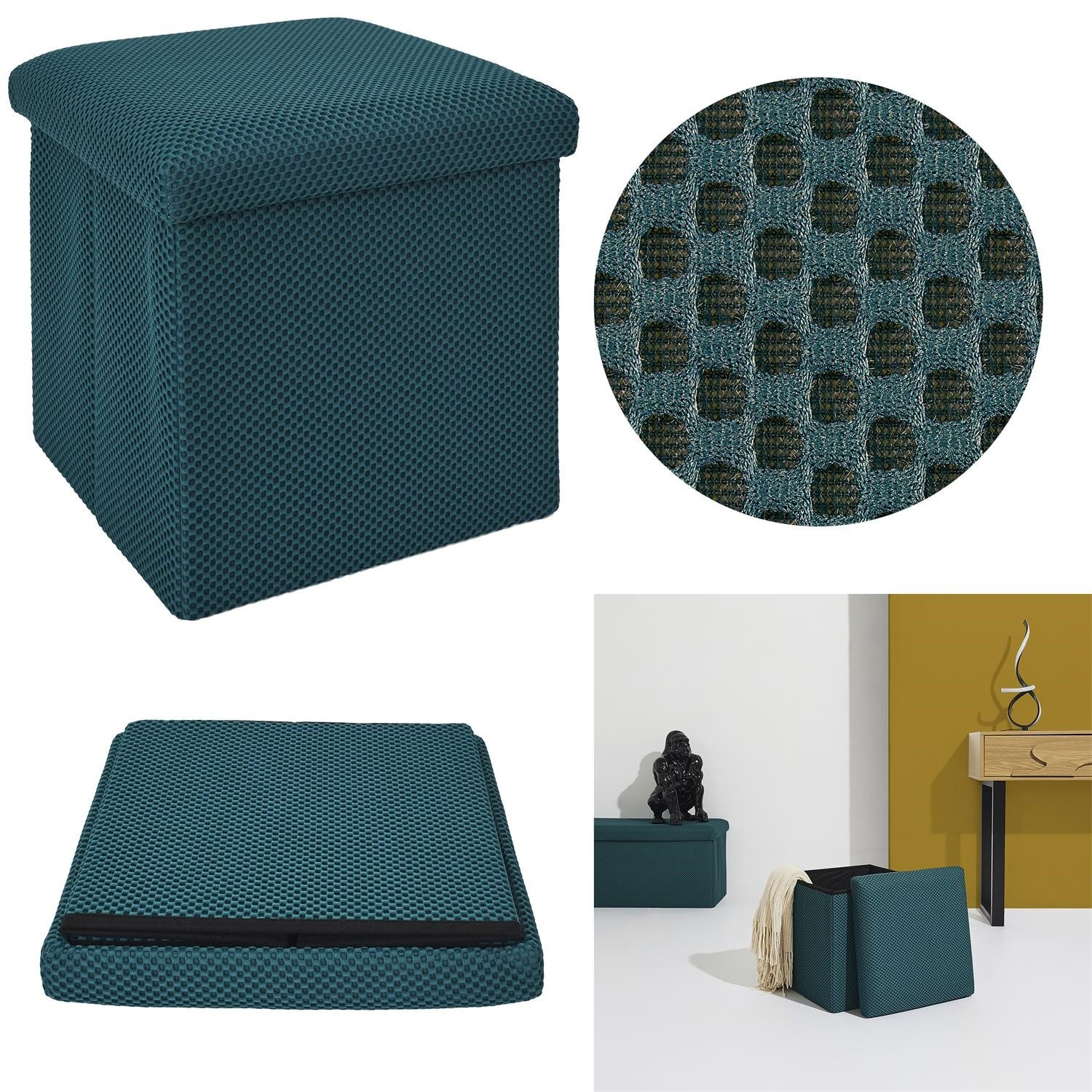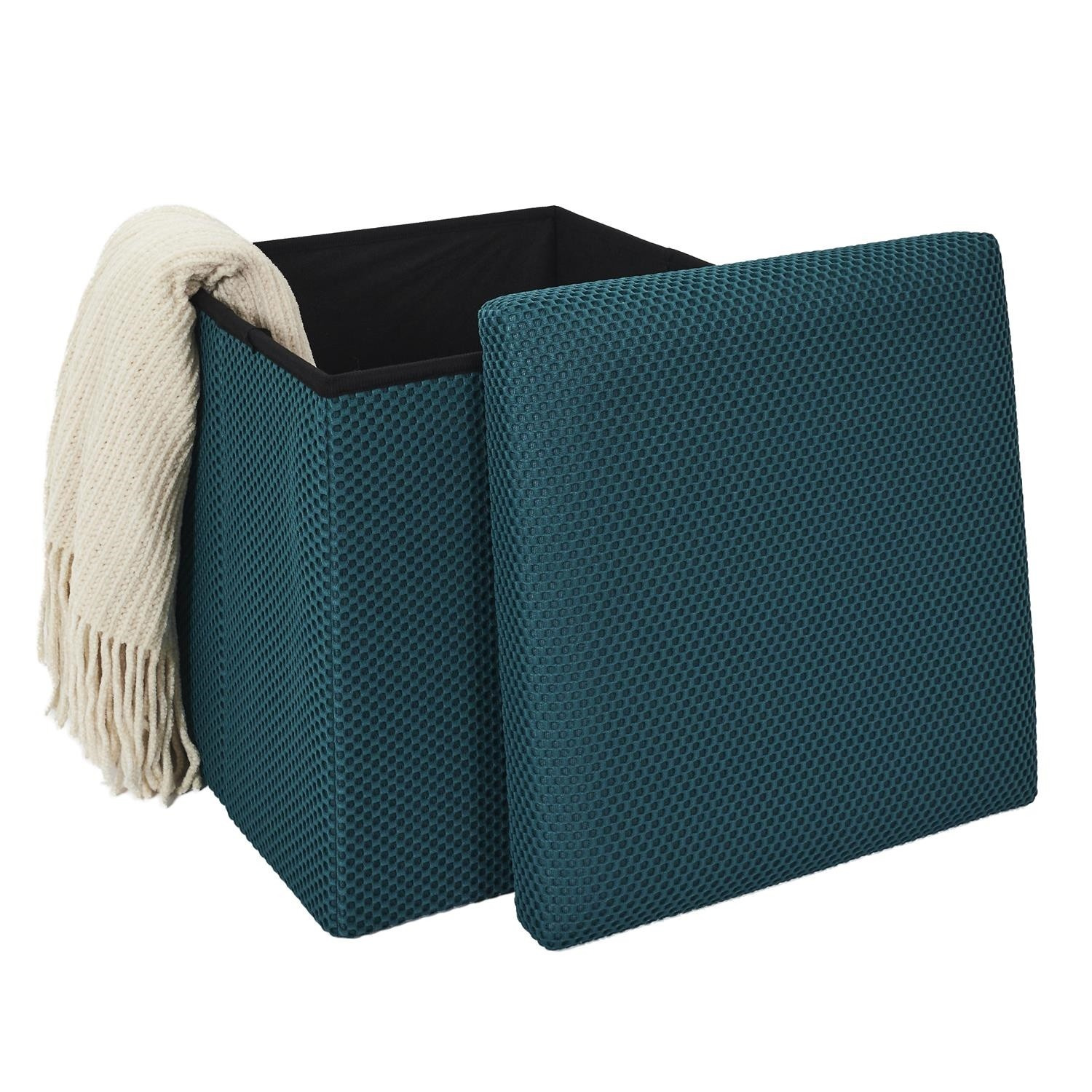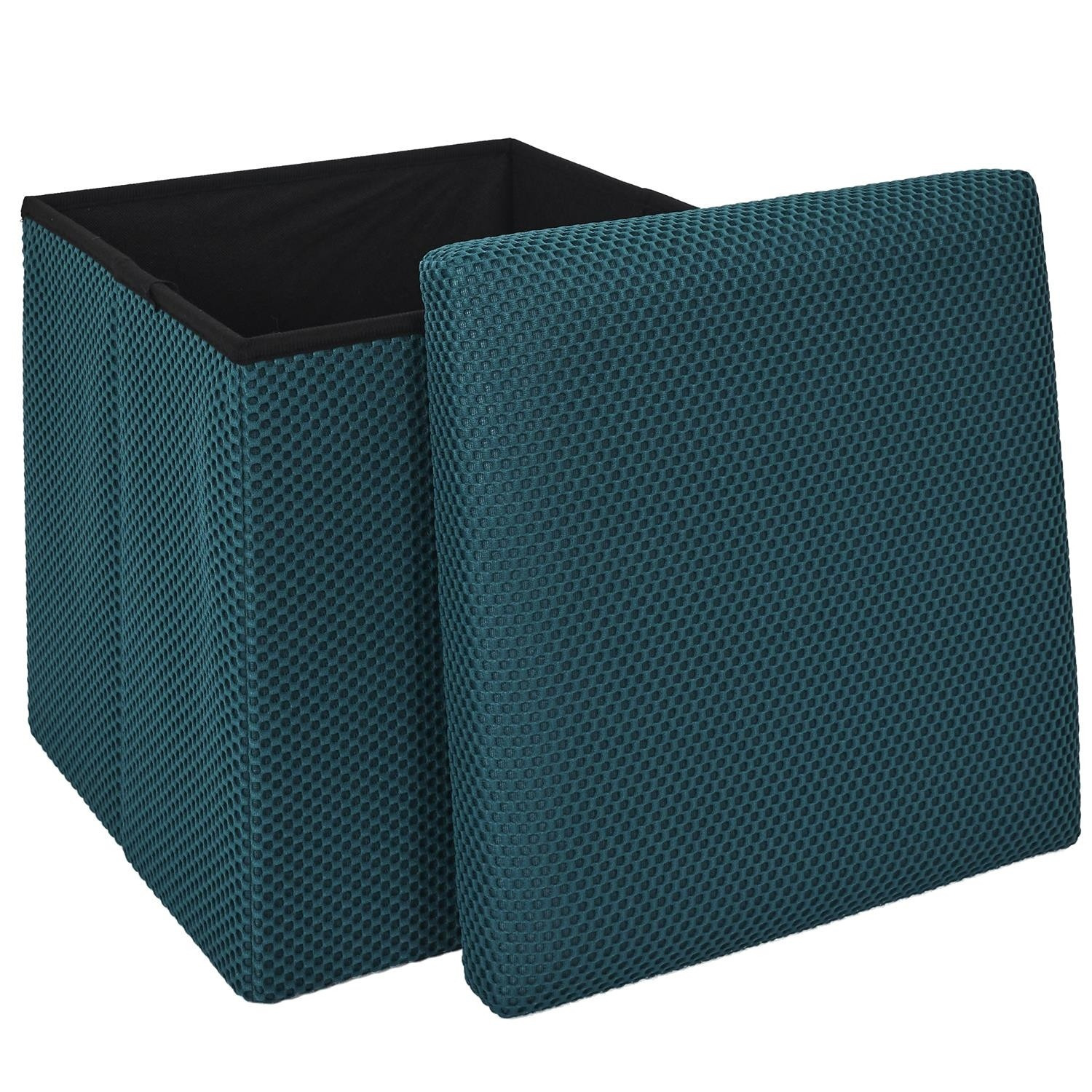 Skládací puf s úložným prostorem je nutností každého studentského bytu nebo pro osoby, které potřebují další místo k sezení a úložný prostor. Puf vyrobený z rámu z odolné MDF desky, která zaručuje maximální přípustné zatížení nábytku až do 110 kg. Puf lze složit, když ji nepoužíváme. Po rozložení nám poskytuje spoustu místa pro uložení jak menších věcí, tak i větších, jako jsou deky, boty nebo knihy. Puf byl ozdoben zajímavou trojrozměrnou tkaninou. Tkanina 100% polyester.
