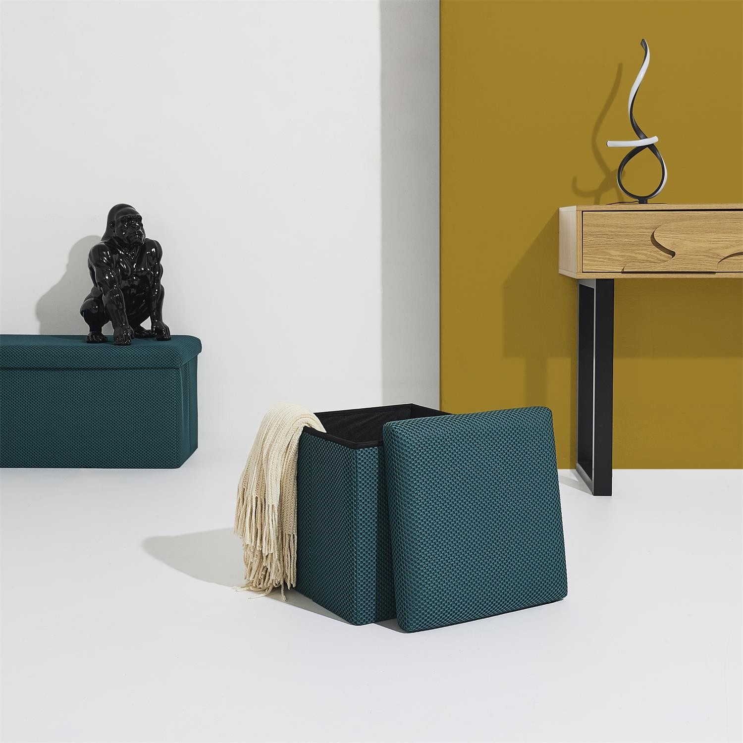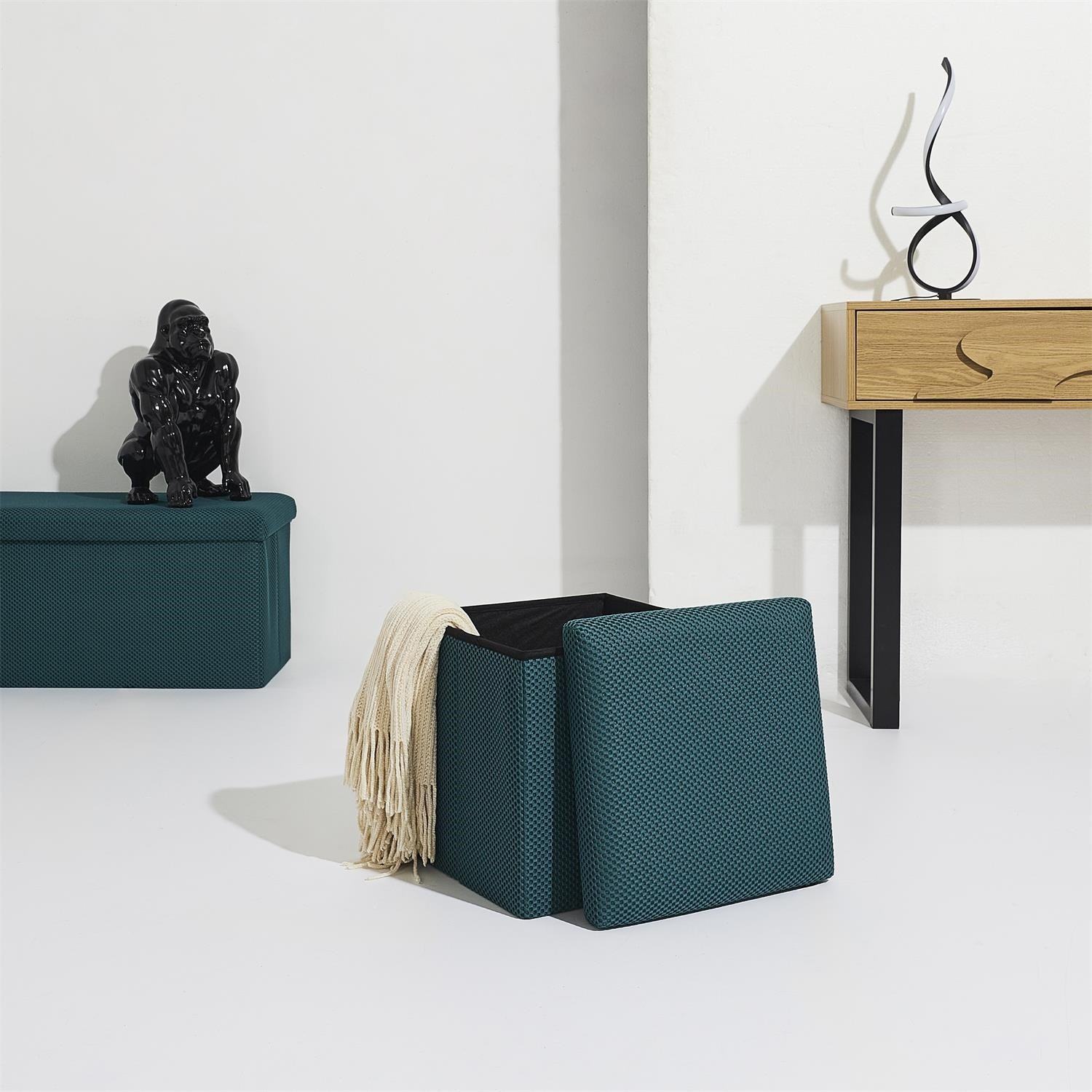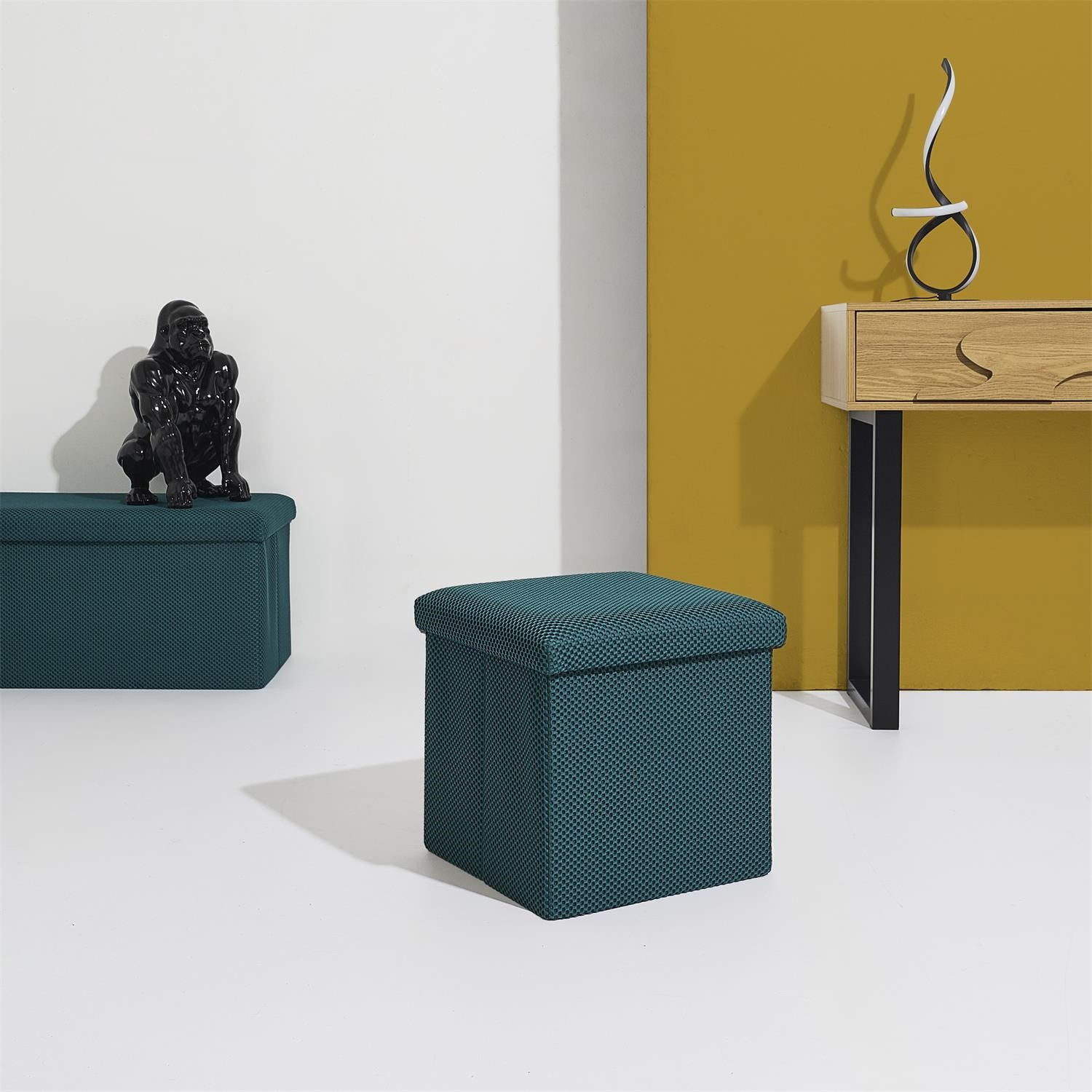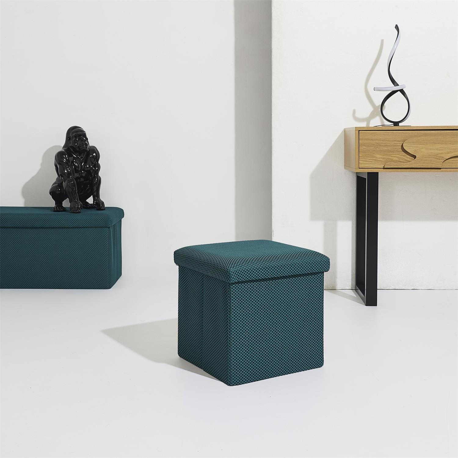 Skládací puf s úložným prostorem je nutností každého studentského bytu nebo pro osoby, které potřebují další místo k sezení a úložný prostor. Puf vyrobený z rámu z odolné MDF desky, která zaručuje maximální přípustné zatížení nábytku až do 110 kg. Puf lze složit, když ji nepoužíváme. Po rozložení nám poskytuje spoustu místa pro uložení jak menších věcí, tak i větších, jako jsou deky, boty nebo knihy. Puf byl ozdoben zajímavou trojrozměrnou tkaninou. Tkanina 100% polyester.