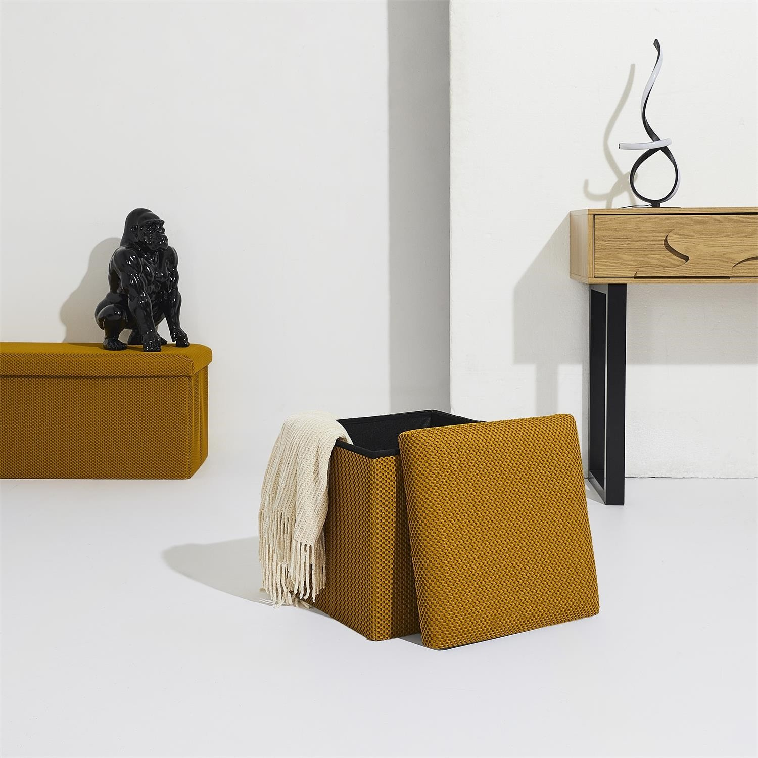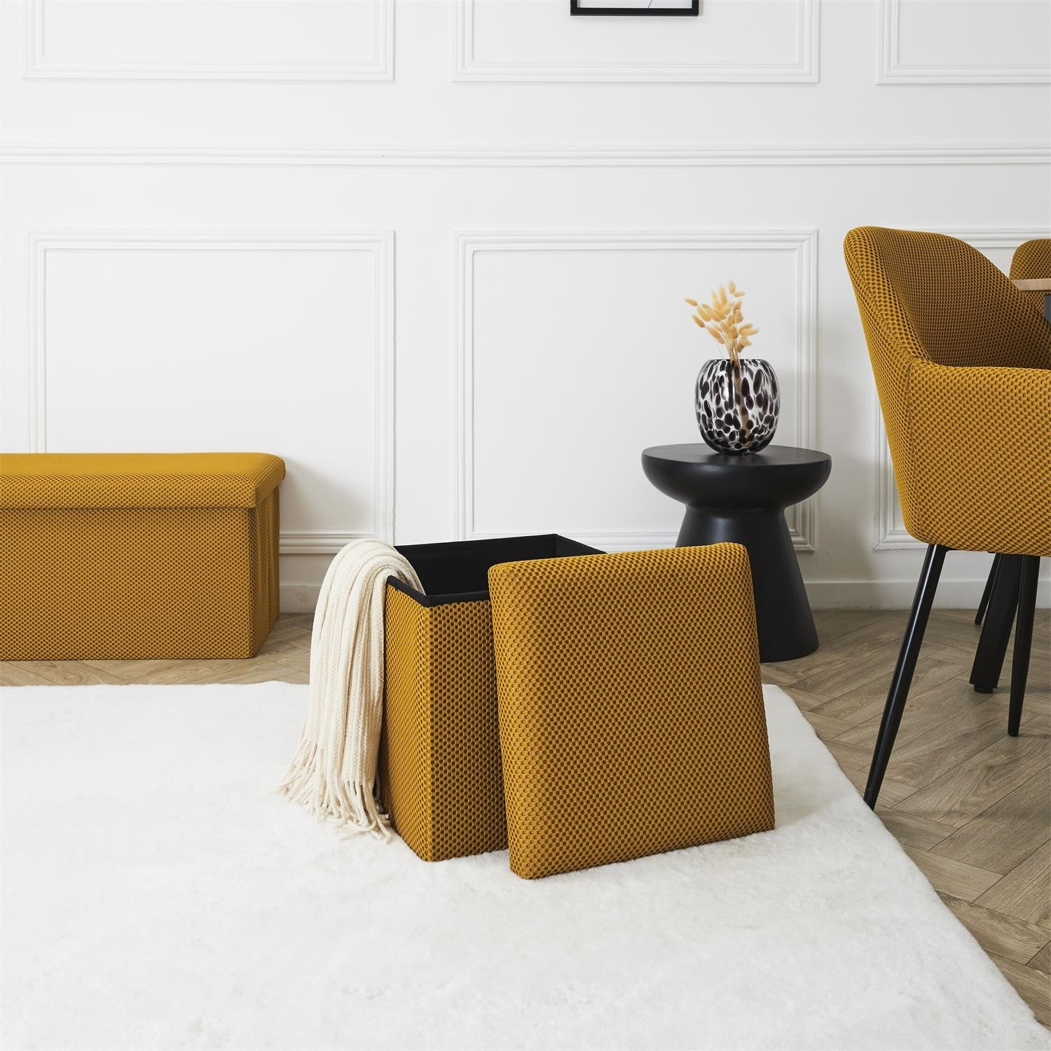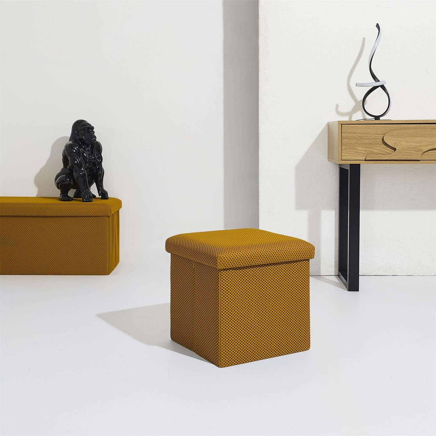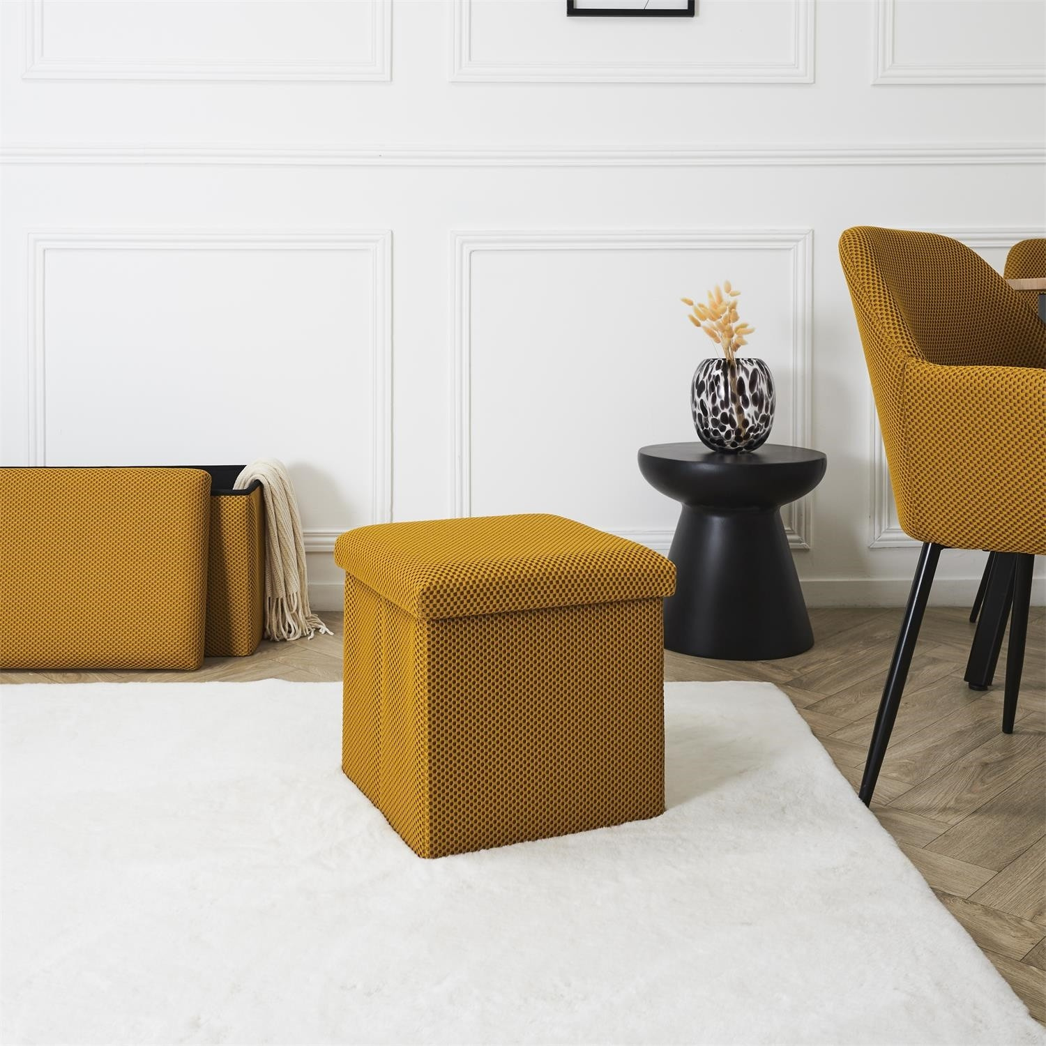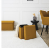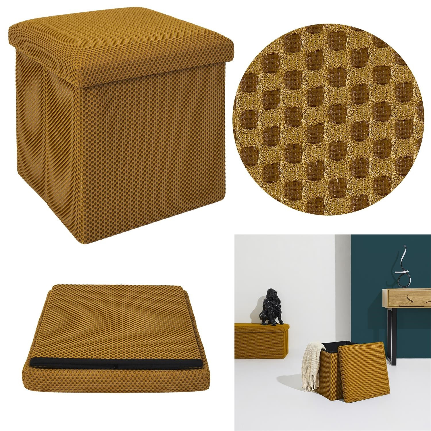 Skládací puf s úložným prostorem je nutností každého studentského bytu nebo pro osoby, které potřebují další místo k sezení a úložný prostor. Puf vyrobený z rámu z odolné MDF desky, která zaručuje maximální přípustné zatížení nábytku až do 110 kg. Puf lze složit, když ji nepoužíváme. Po rozložení nám poskytuje spoustu místa pro uložení jak menších věcí, tak i větších, jako jsou deky, boty nebo knihy. Puf byl ozdoben zajímavou trojrozměrnou tkaninou. Tkanina 100% polyester.