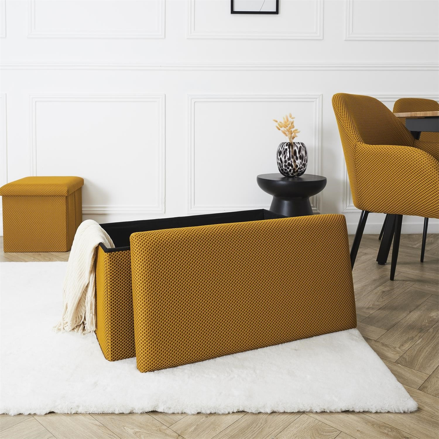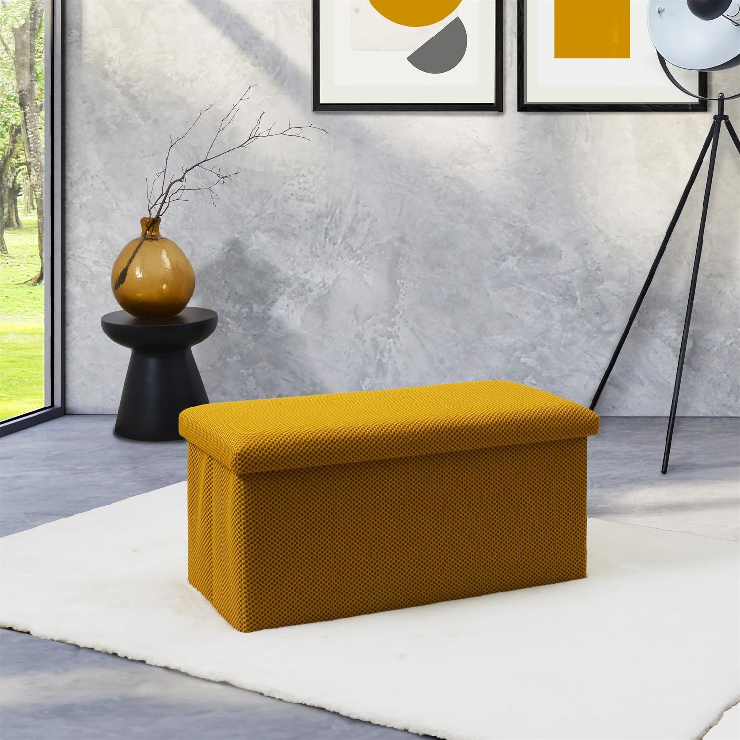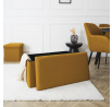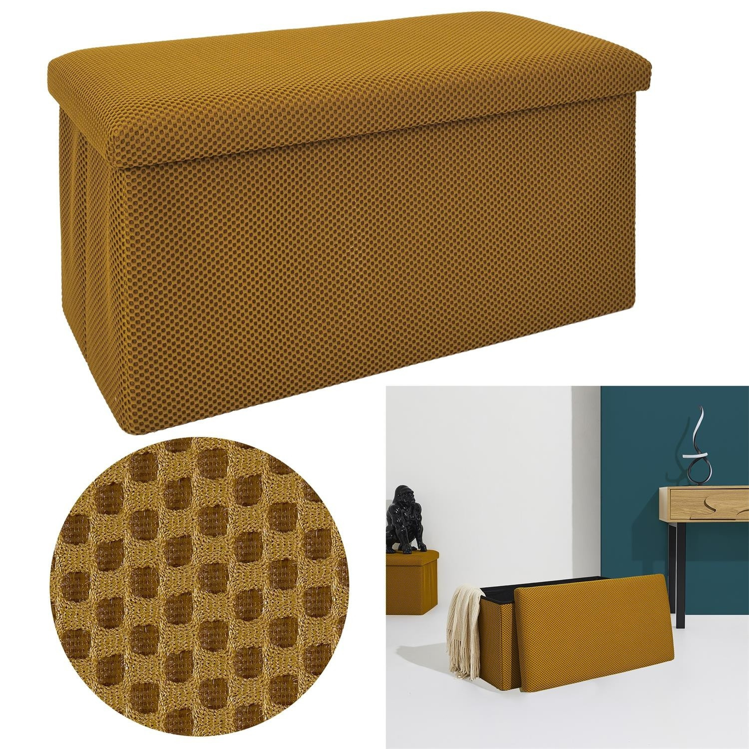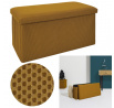 Skládací puf s úložným prostorem je nutností každého studentského bytu nebo pro osoby, které potřebují další místo k sezení a úložný prostor. Puf vyrobený z rámu z odolné MDF desky, která zaručuje maximální přípustné zatížení nábytku až do 110 kg. Puf lze složit, když ji nepoužíváme. Po rozložení nám poskytuje spoustu místa pro uložení jak menších věcí, tak i větších, jako jsou deky, boty nebo knihy. Puf byl ozdoben zajímavou trojrozměrnou tkaninou. Tkanina 100% polyester.