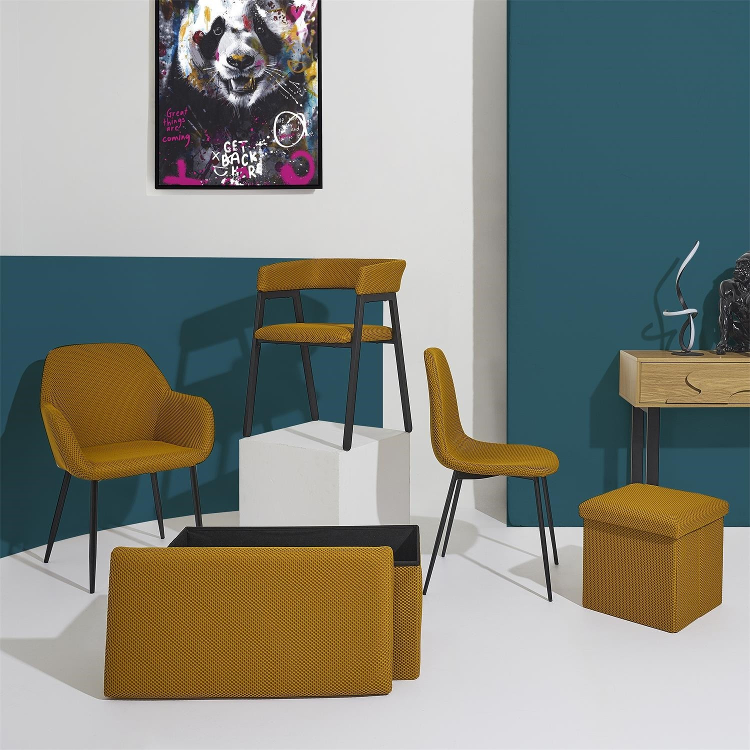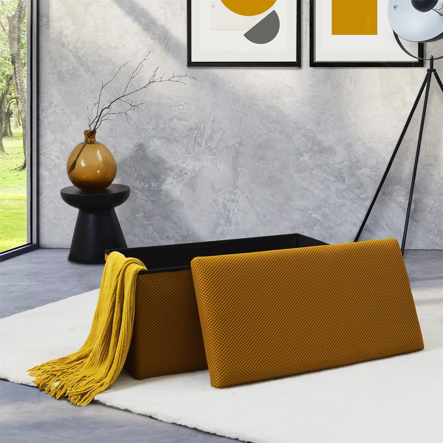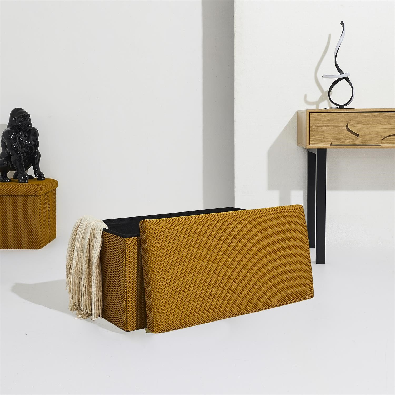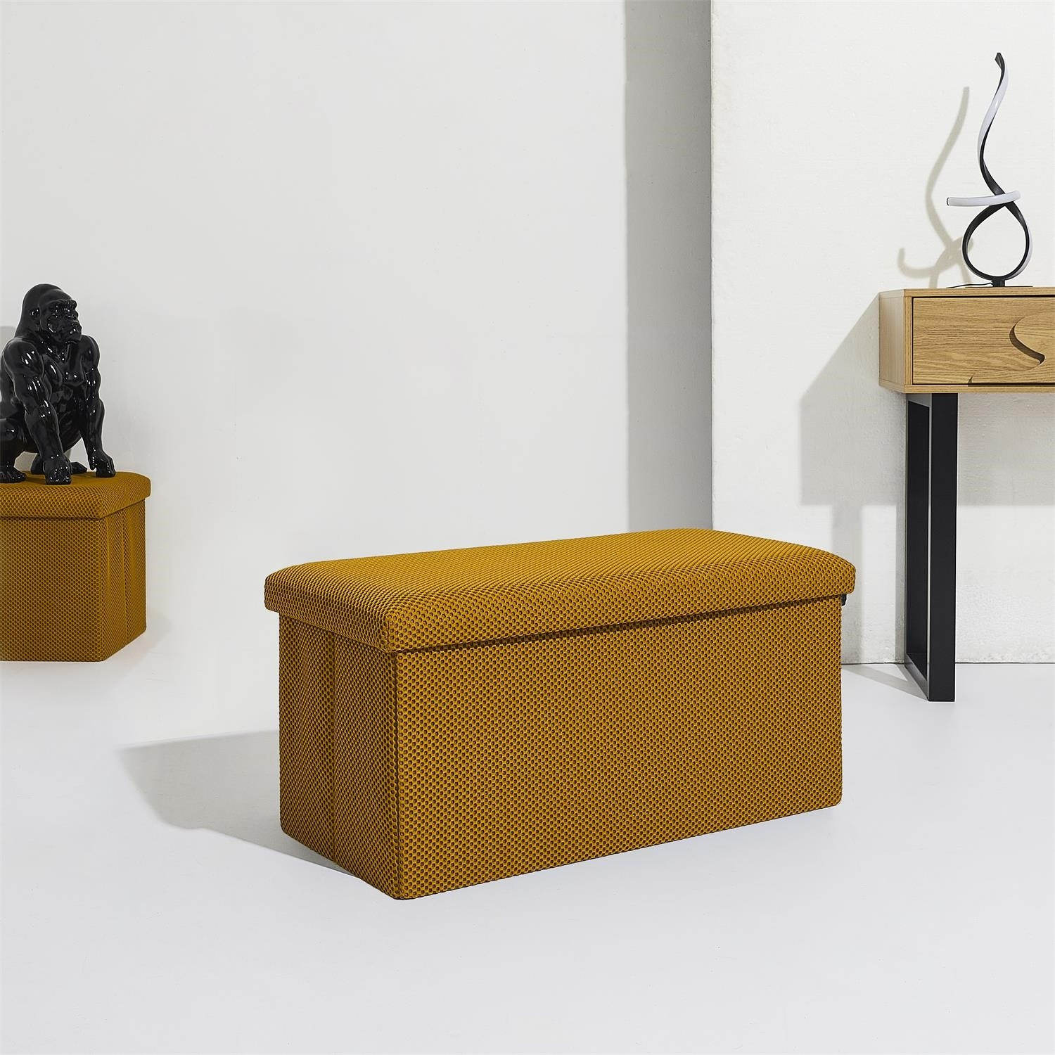 Skládací puf s úložným prostorem je nutností každého studentského bytu nebo pro osoby, které potřebují další místo k sezení a úložný prostor. Puf vyrobený z rámu z odolné MDF desky, která zaručuje maximální přípustné zatížení nábytku až do 110 kg. Puf lze složit, když ji nepoužíváme. Po rozložení nám poskytuje spoustu místa pro uložení jak menších věcí, tak i větších, jako jsou deky, boty nebo knihy. Puf byl ozdoben zajímavou trojrozměrnou tkaninou. Tkanina 100% polyester.