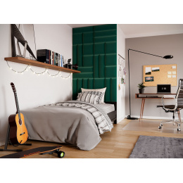 Sada Quadratta 120x195 se skládá z 26 panelů o rozměrech 30x30 (10 ks) a 60x15 (16 ks). Nástěnný panel Quadratta získává svou odolnost díky použití MDF desky. Tato součást je známá svou vysokou odolností vůči mechanickému poškození a svou značně nízkou hmotností, díky čemuž nezatěžuje stěnu. Není tedy divu, že náš produkt dokáže odolat prakticky jakékoli domácí situaci! Na základnu byla umístěna 3 cm silná vrstva pěny T21. To způsobilo, že panel je příjemně měkký a flexibilní. Můžete jej tedy úspěšně použít jako pohodlnou opěrku hlavy, která pěkně doplňuje vaši postel a činí z ní potěšení opřít se o dosud nepohodlnou zeď. Čalouněné panely Quadratta jsou potaženy moderní látkou ve stylu semiše. Materiál se vyznačuje nejen příjemnou texturou na dotek, ale také vysokou odolností a odolností vůči oděru, tření a žmolkování. Kromě toho je vyroben pomocí hydrofobní technologie. To znamená, že neabsorbuje tekutiny, což vám usnadňuje udržovat celou věc hygienicky čistou. Instalace čalouněných panelů je rychlá a snadná, bez použití profesionálního vybavení. Panel vytvoří krásnou kombinaci s dalšími kousky z kolekce Quadratta. Každý panel lze zakoupit jako sadu nebo samostatně.