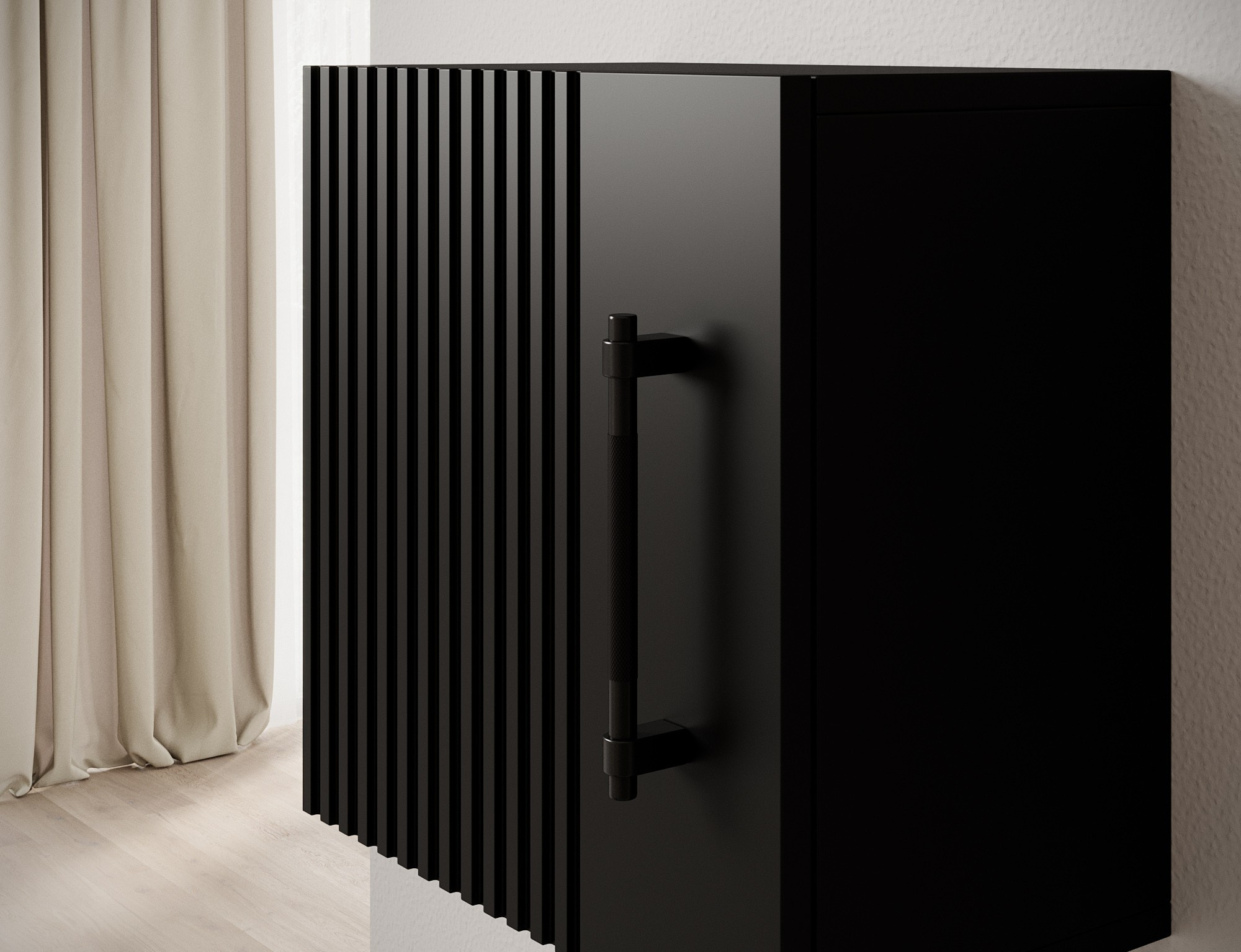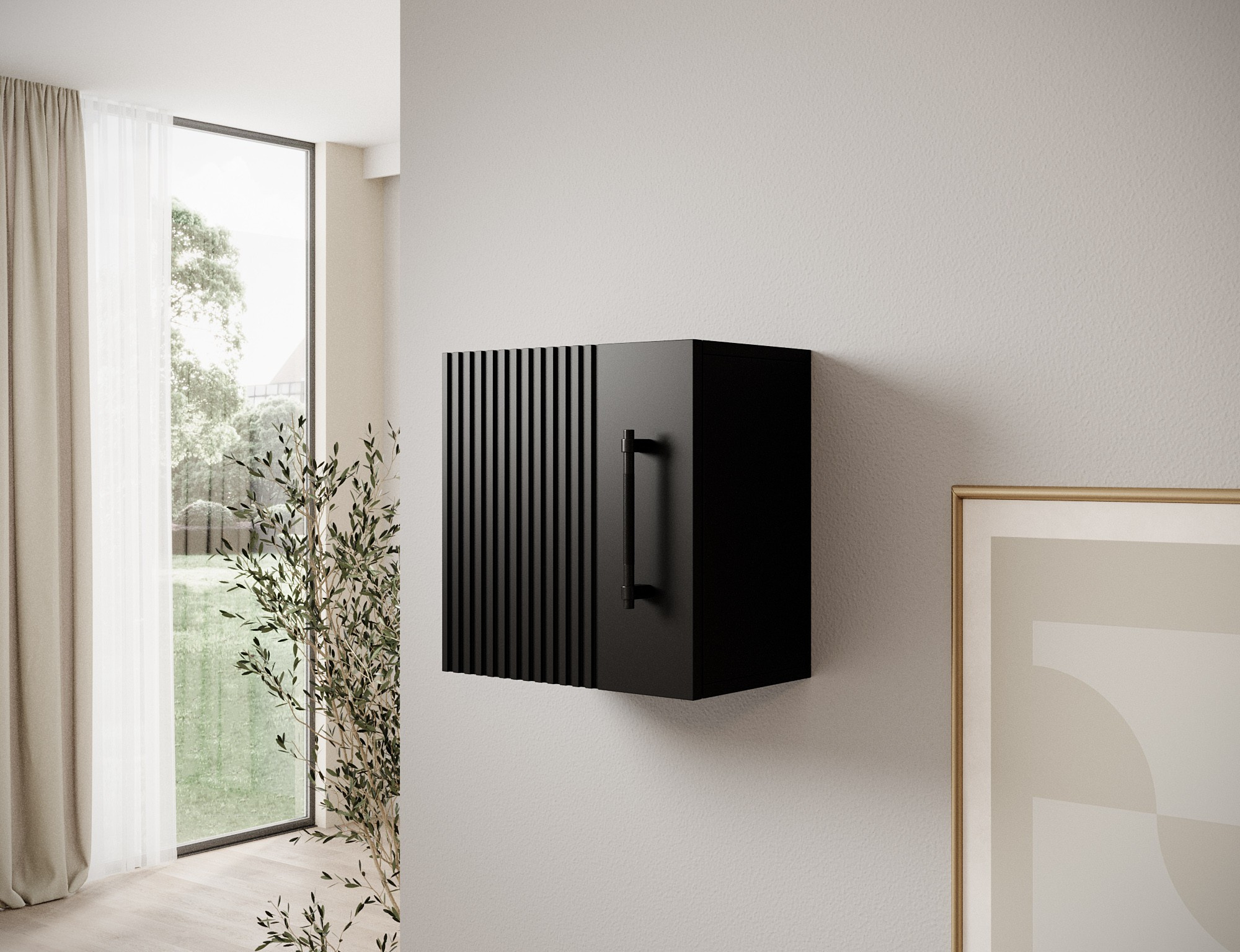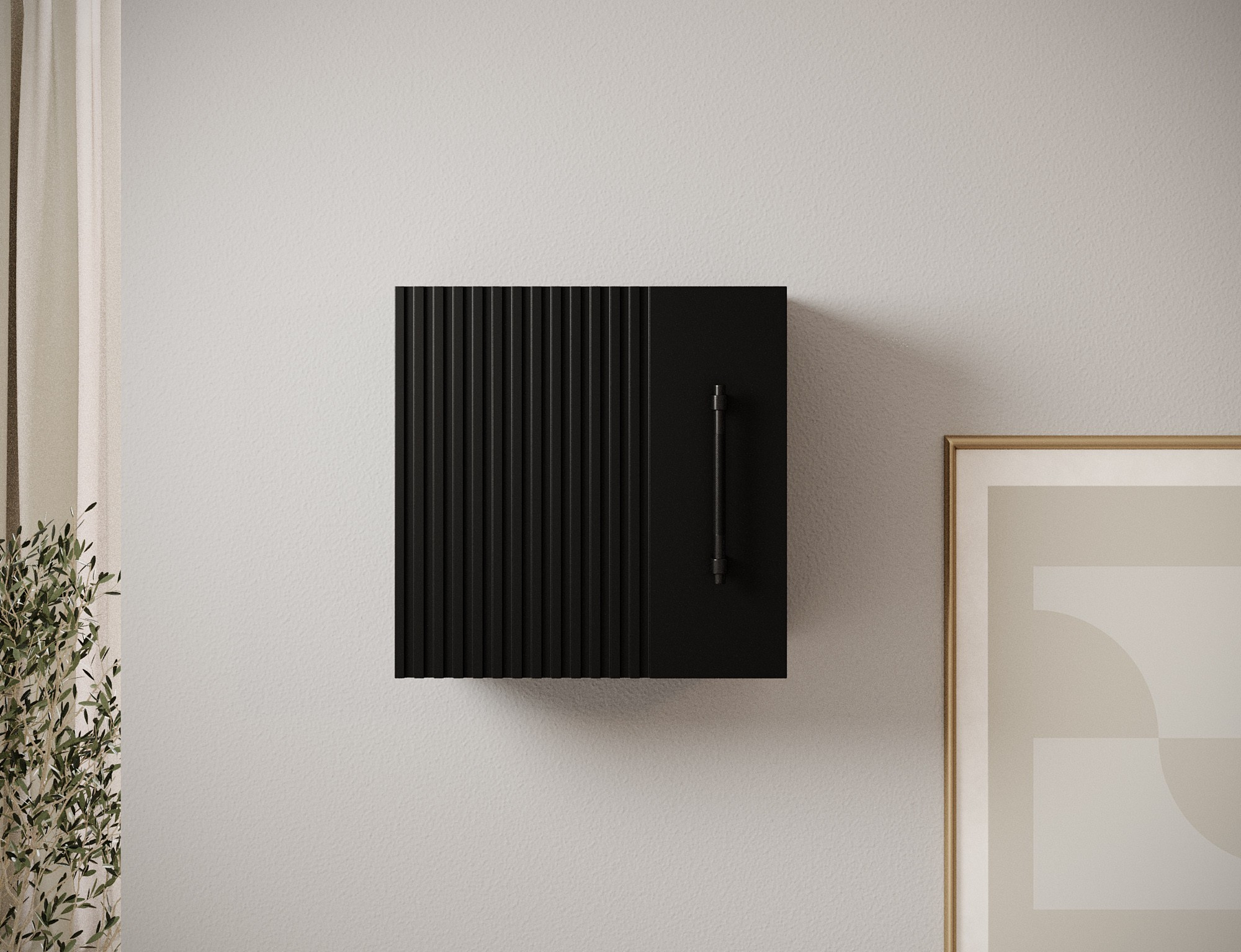 Nástěnná skříňka z kolekce Raftt je ideálním řešením pro ty, kteří oceňují moderní a industriální styl. Vyrobeno z laminované dřevotřísky s drážkovanou přední částí z fólií potaženého MDF, vyniká elegantním provedením a surovou estetikou loftového designu. Kus je vybaven dveřmi na pantech, které jsou namontovány na pantech s tichým zavíráním, což zajišťuje tichý a pohodlný provoz. Černé hliníkové úchyty doplňují celkový design a zdůrazňují industriální charakter skříně. Možnost montáže na zeď jej činí vhodným pro různé prostory—obývací pokoje, ložnice nebo kanceláře. Je to ideální kombinace funkčnosti a estetiky, perfektní pro jakýkoli loftový, industriální nebo moderní interiér.
