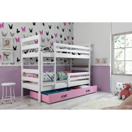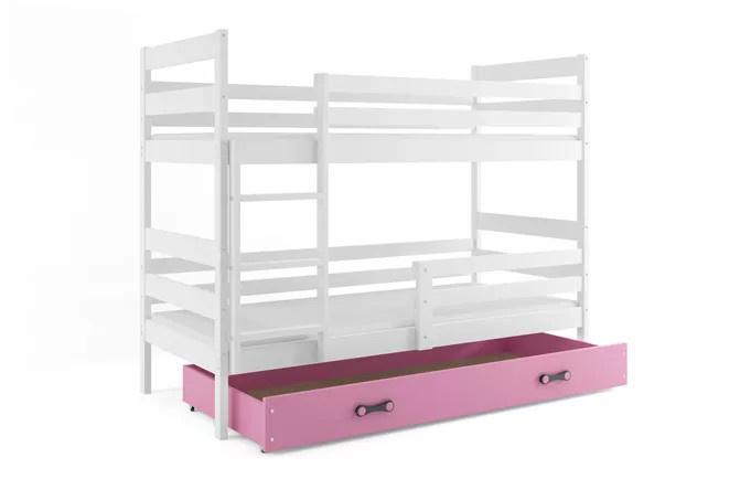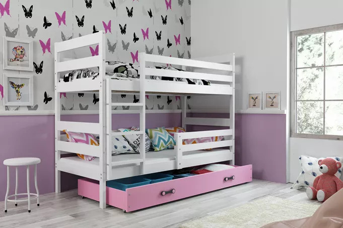 Dětská patrová postel ERYK se šuplíkem 90x200 cm, včetně matrací, Bílá/Růžová