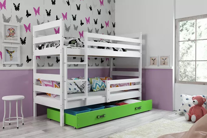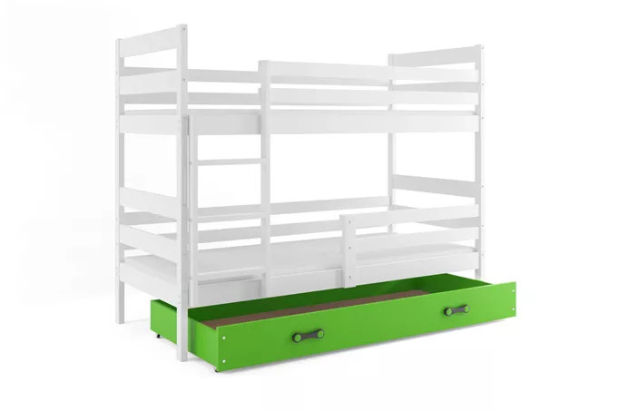 Dětská patrová postel ERYK se šuplíkem 90x200 cm, včetně matrací, Bílá/Zelená