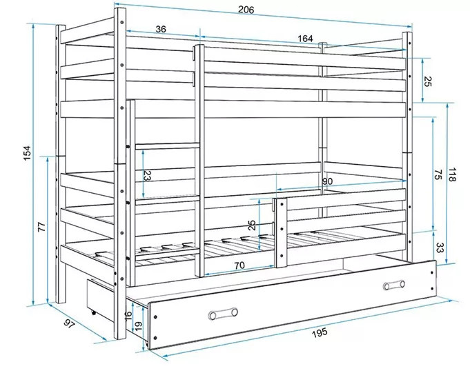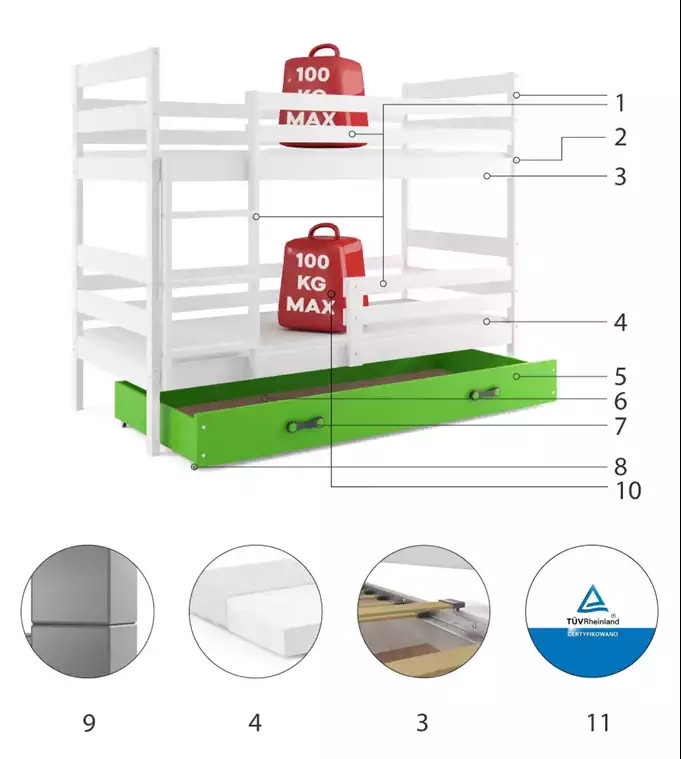 Dětská patrová postel ERYK se šuplíkem 90x200 cm, bez matrace, Bílá/Zelená