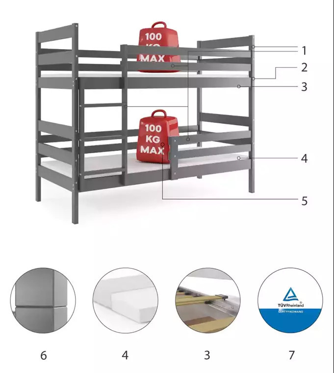 Dětská patrová postel ERYK 90x200 cm, bez matrace, Grafit
