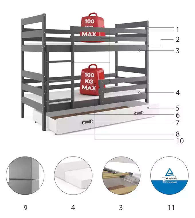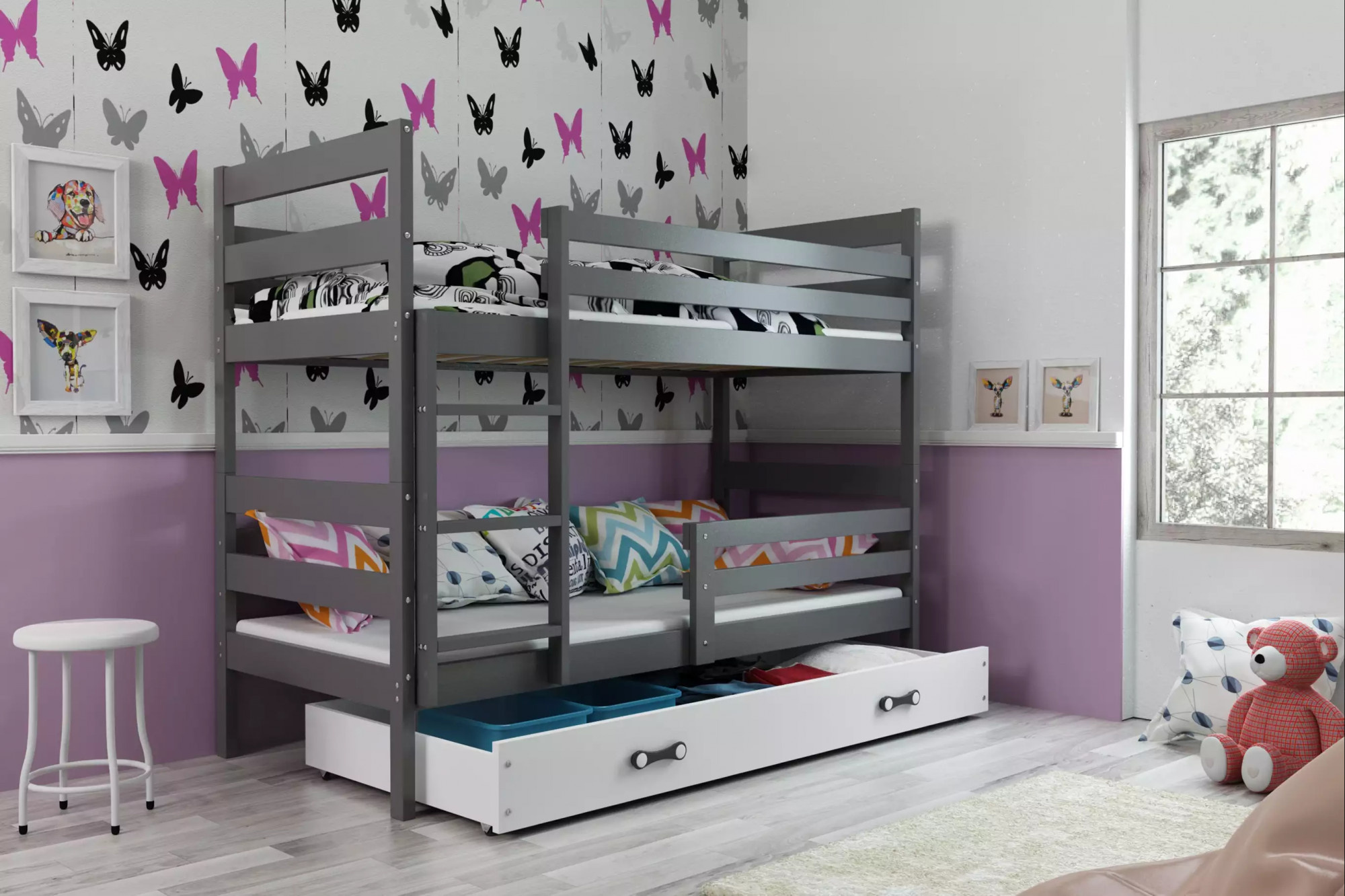 Dětská patrová postel ERYK se šuplíkem 90x200 cm, bez matrace, Grafit/Bílá