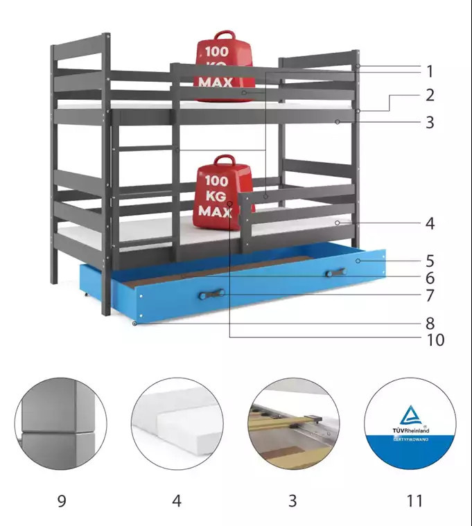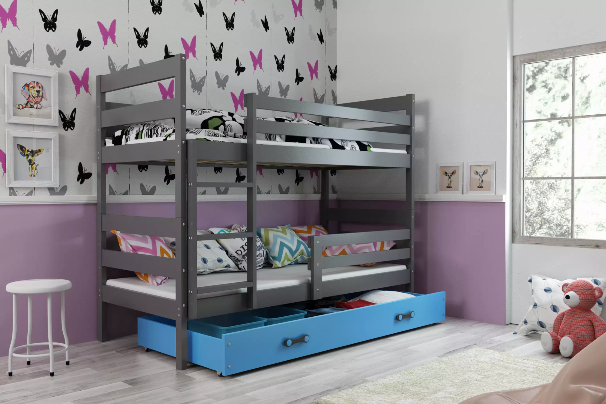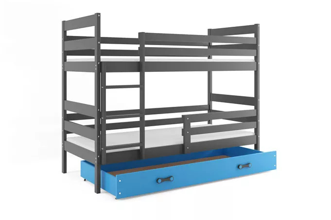 Dětská patrová postel ERYK se šuplíkem 90x200 cm, bez matrace, Grafit/Modrá