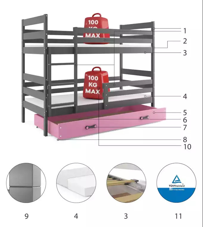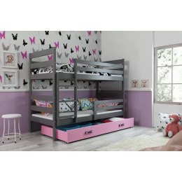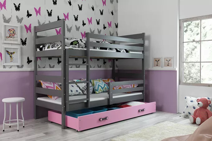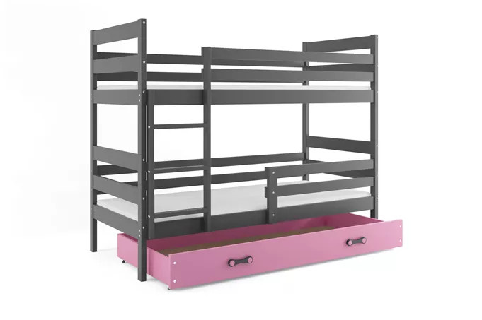 Dětská patrová postel ERYK se šuplíkem 90x200 cm, včetně matrací, Grafit/Růžová