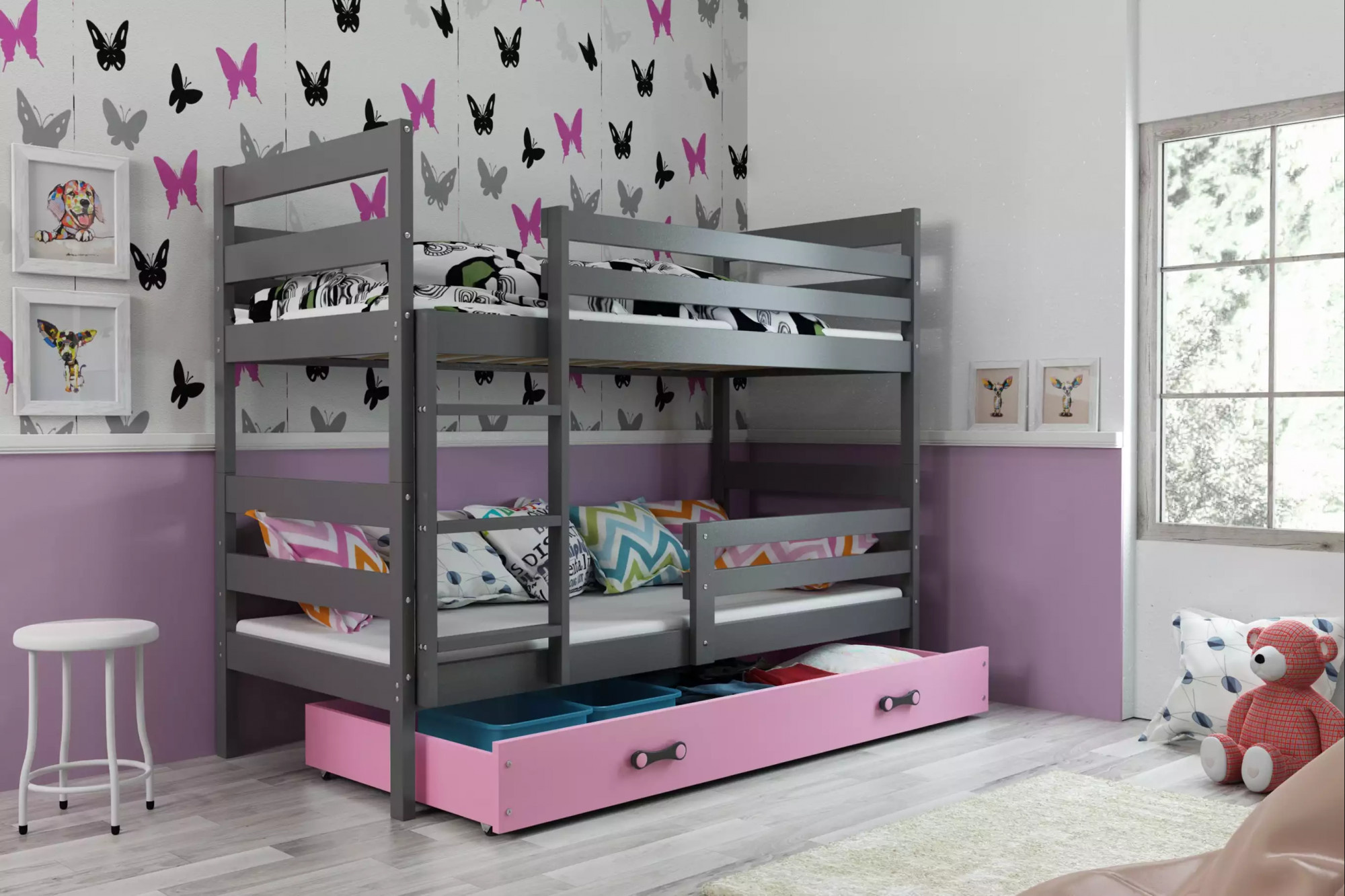 Dětská patrová postel ERYK se šuplíkem 90x200 cm, bez matrace, Grafit/Růžová
