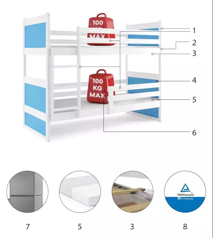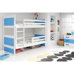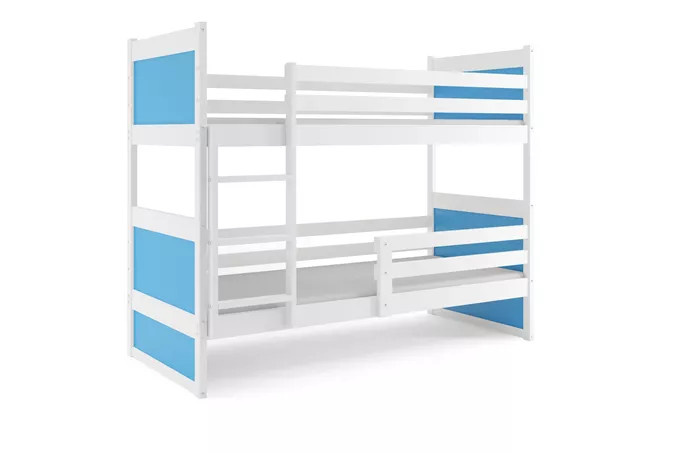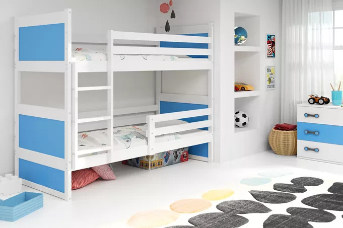 Dětská patrová postel RICO 90x200 cm, včetně matrací, Bílá/Modrá